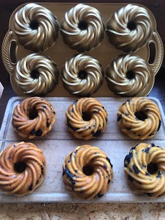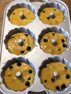 Versate in ogni ciambella circa un cucchiaio e mezzo di impasto, unite gli acini d’uva e terminate con un cucchiaio circa d’impasto.