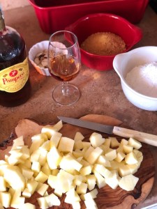 Sciogliere 20 gr di burro in una padella antiaderente , cuocere le mele aggiungendo 30 gr di zucchero fino a che non saranno caramellate, aggiungere il rum e infiammare, aspettare che si raffreddino.