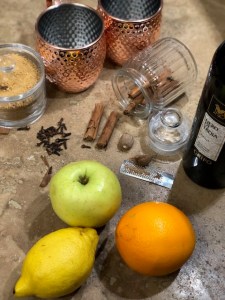 In una pentola capiente mettere il vino con lo zucchero ed il resto degli ingredienti, fare cuocere fino a che si sia sciolto bene lo zucchero (per circa 10 minuti).