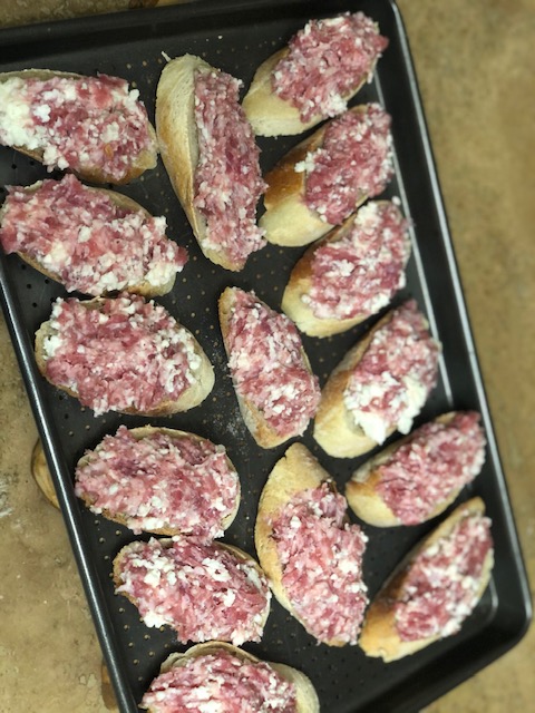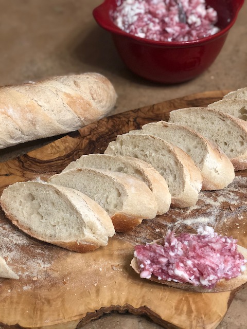 Affettare la baguette a fette di 1 cm circa, spalmare sulla fetta uno strato consistente di composto.