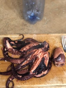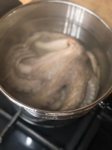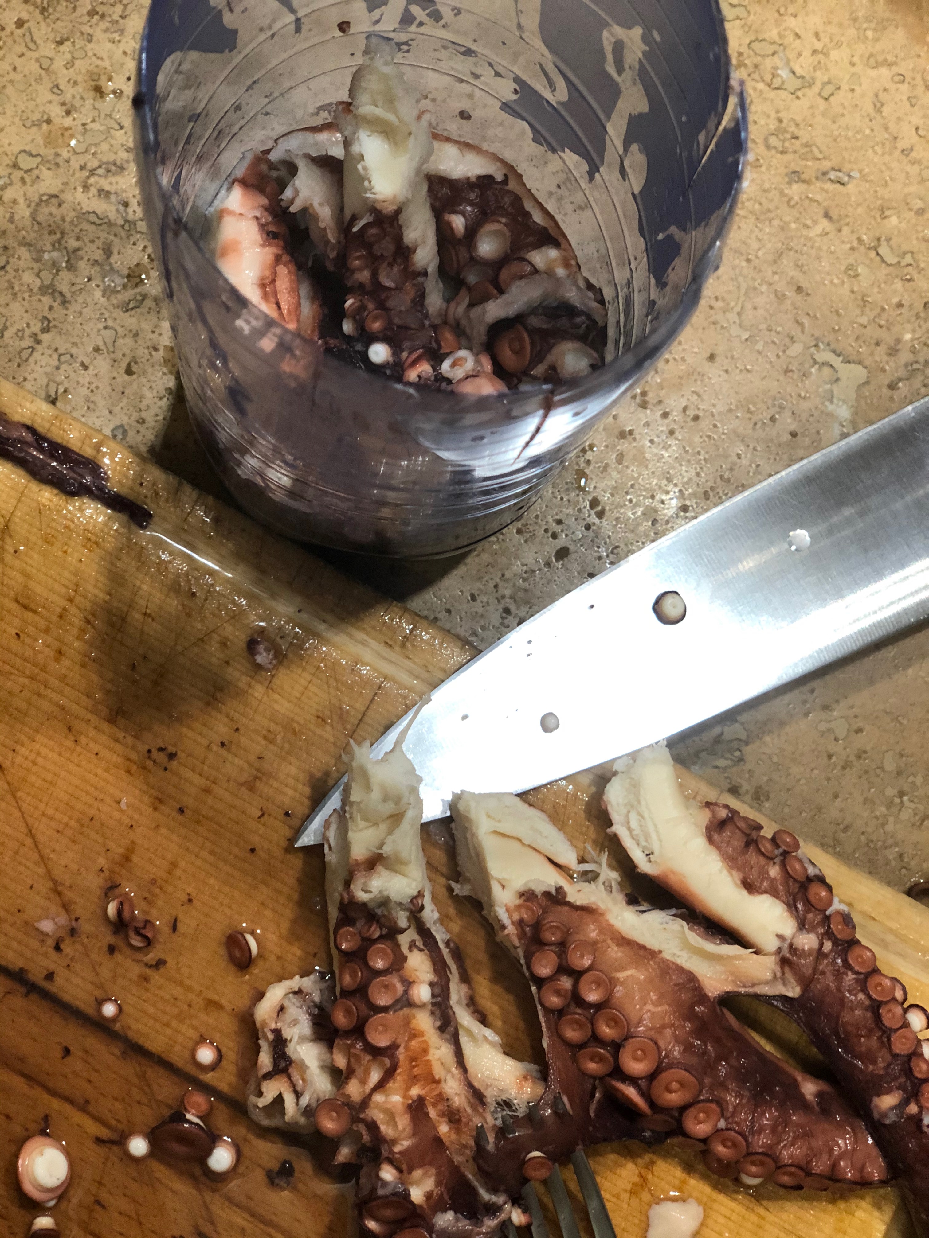 Togliere il polpo dall’acqua, mettere sul tagliere e tagliare i tentacoli.