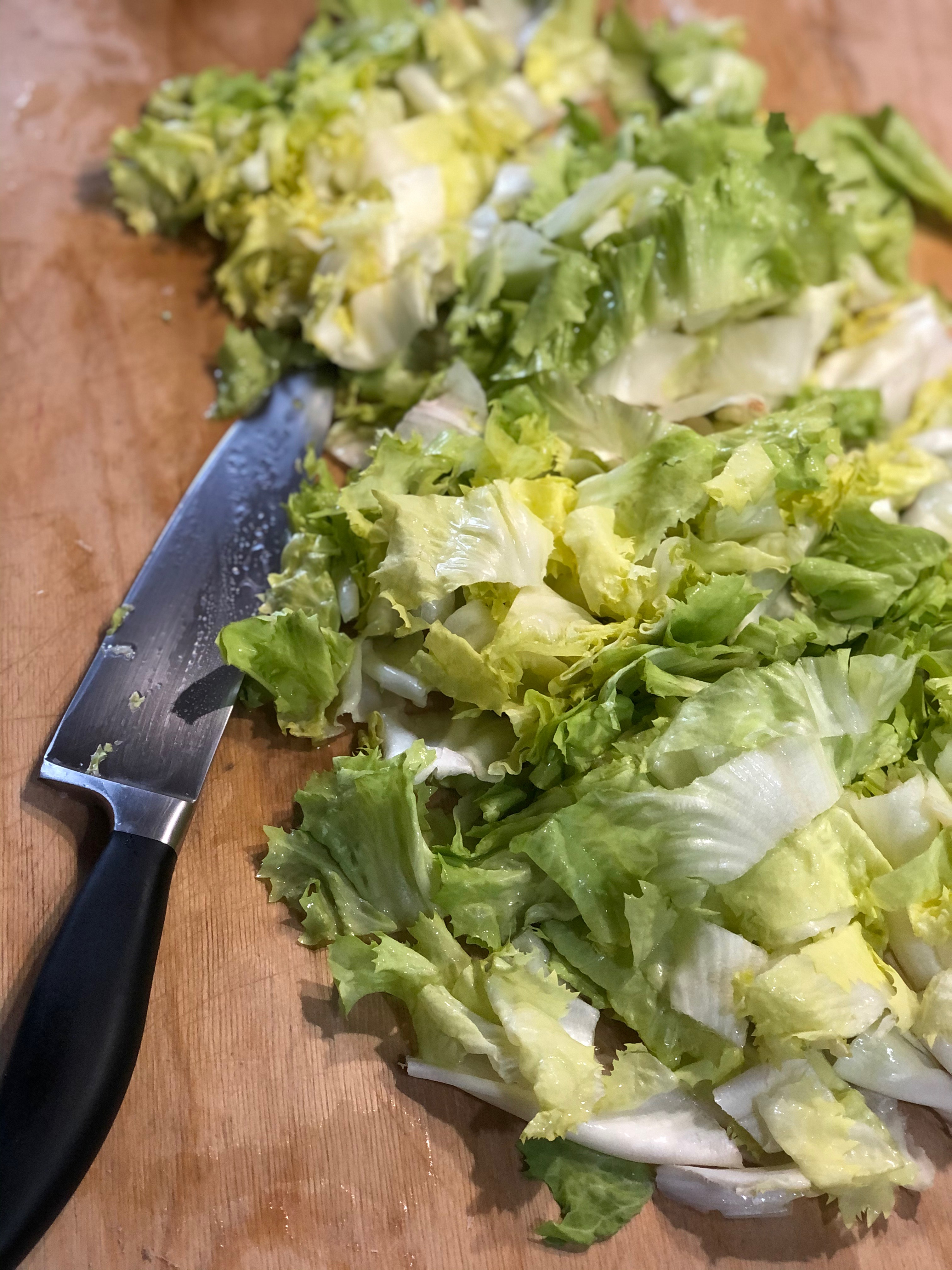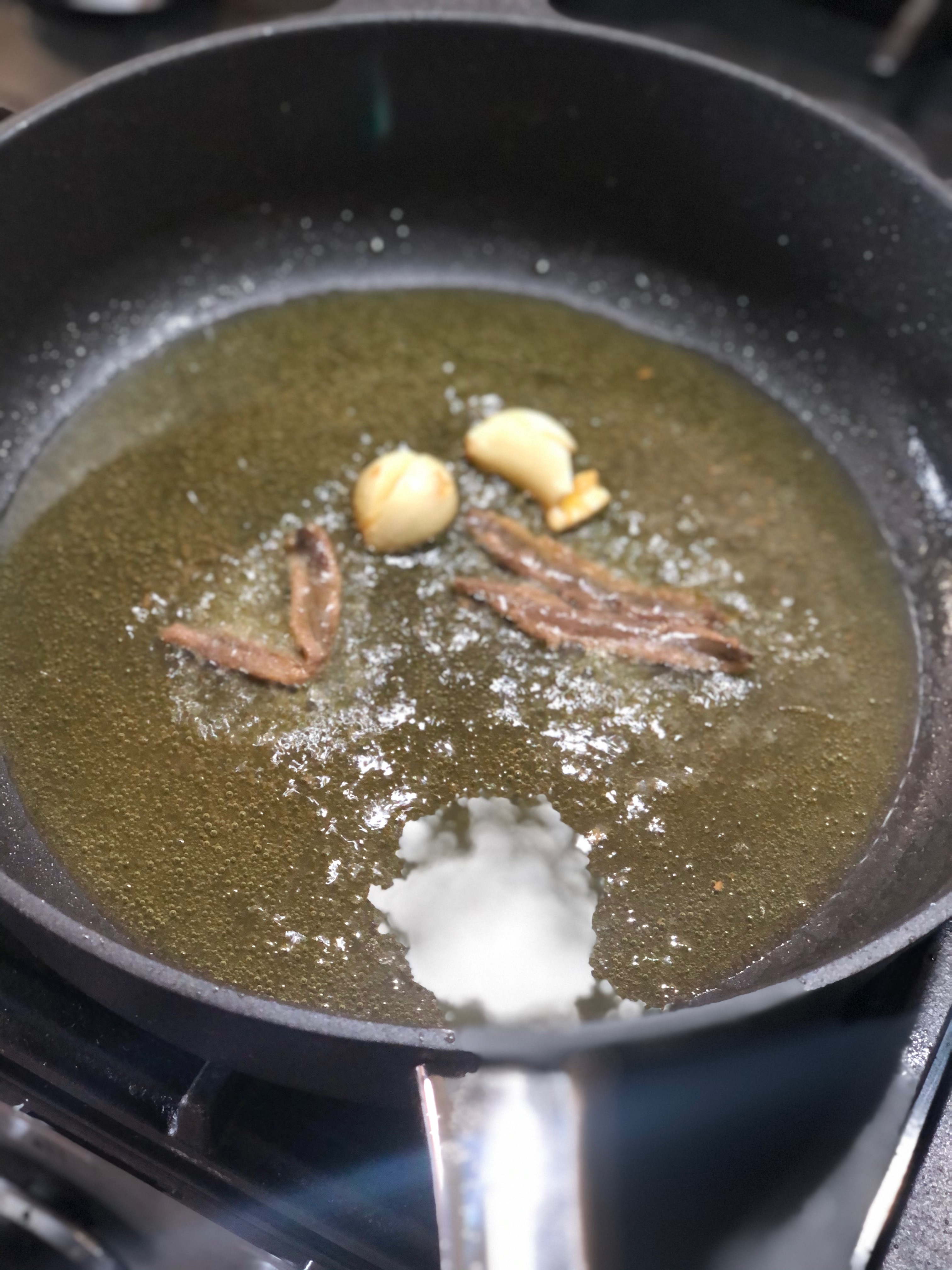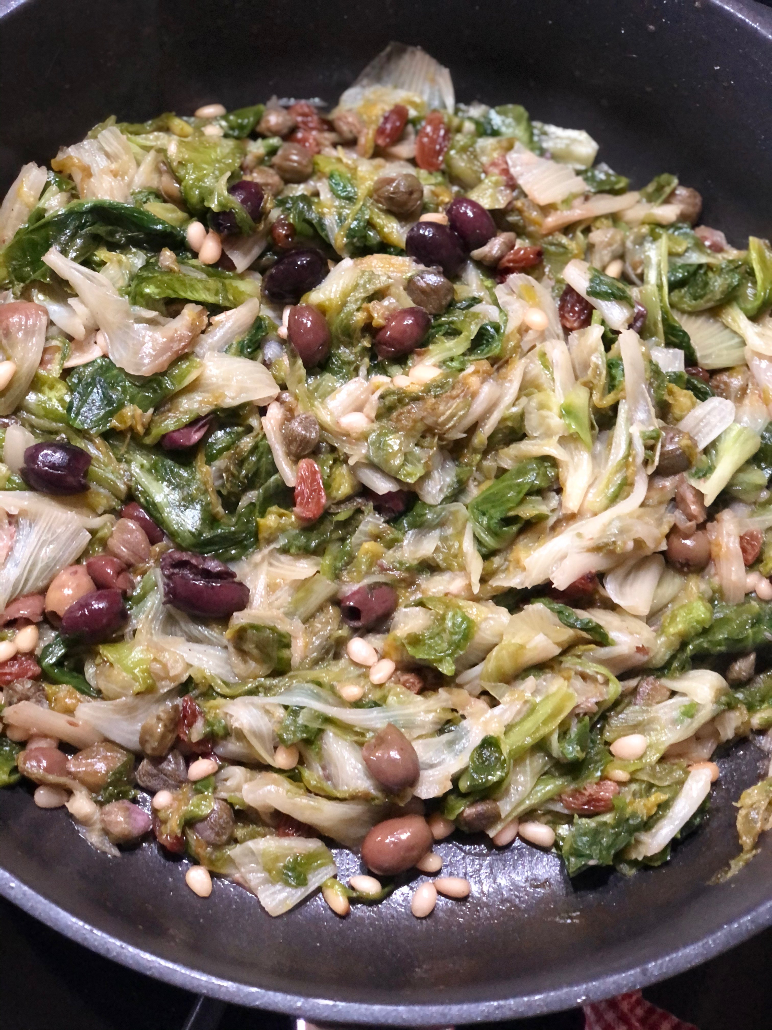 Mettere quattro cucchiai di olio in padella con l’aglio, soffriggere, aggiungere l’acciuga scioglierla nell’olio, aggiungere la scarola tagliata a grandi strisce, spadellare fino a che non appassisca, salare e pepare, infine aggiungere olive, pinoli, capperi e uvetta e lasciare sul fuoco fino a che si asciughi.