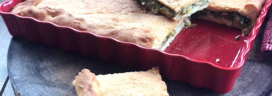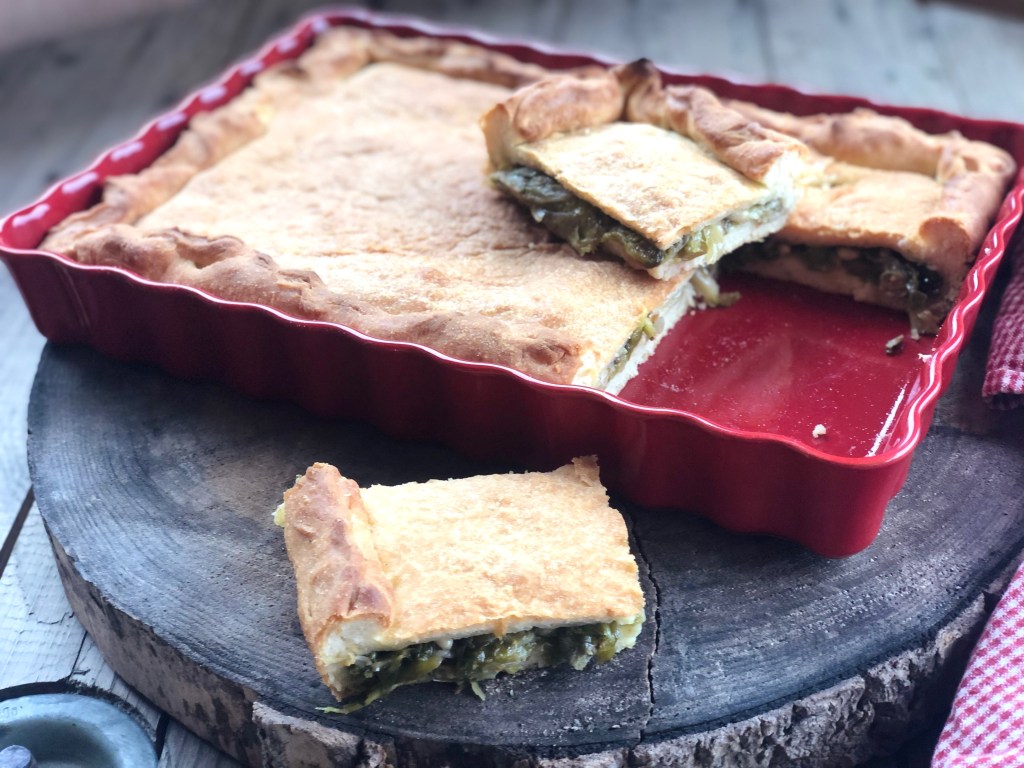 Riprendere l’impasto, dividerlo in due, stenderla formando due rettangoli, uno leggermente più grande e uno leggermente più piccolo, oliare la teglia e foderarla facendo sbordare l’impasto ai lati, versarvi il ripieno, chiudere con il secondo rettangolo sigillando bene i bordi.
