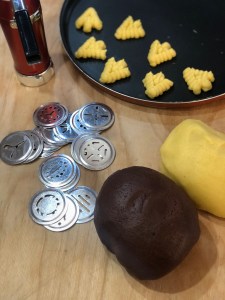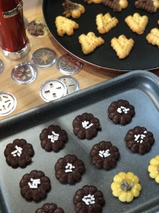 Utilizzare una sparabiscotti, scegliere il disco, inserire l’impasto, scegliere la grandezza del biscotto e adagiarli sulla teglia senza carta forno.