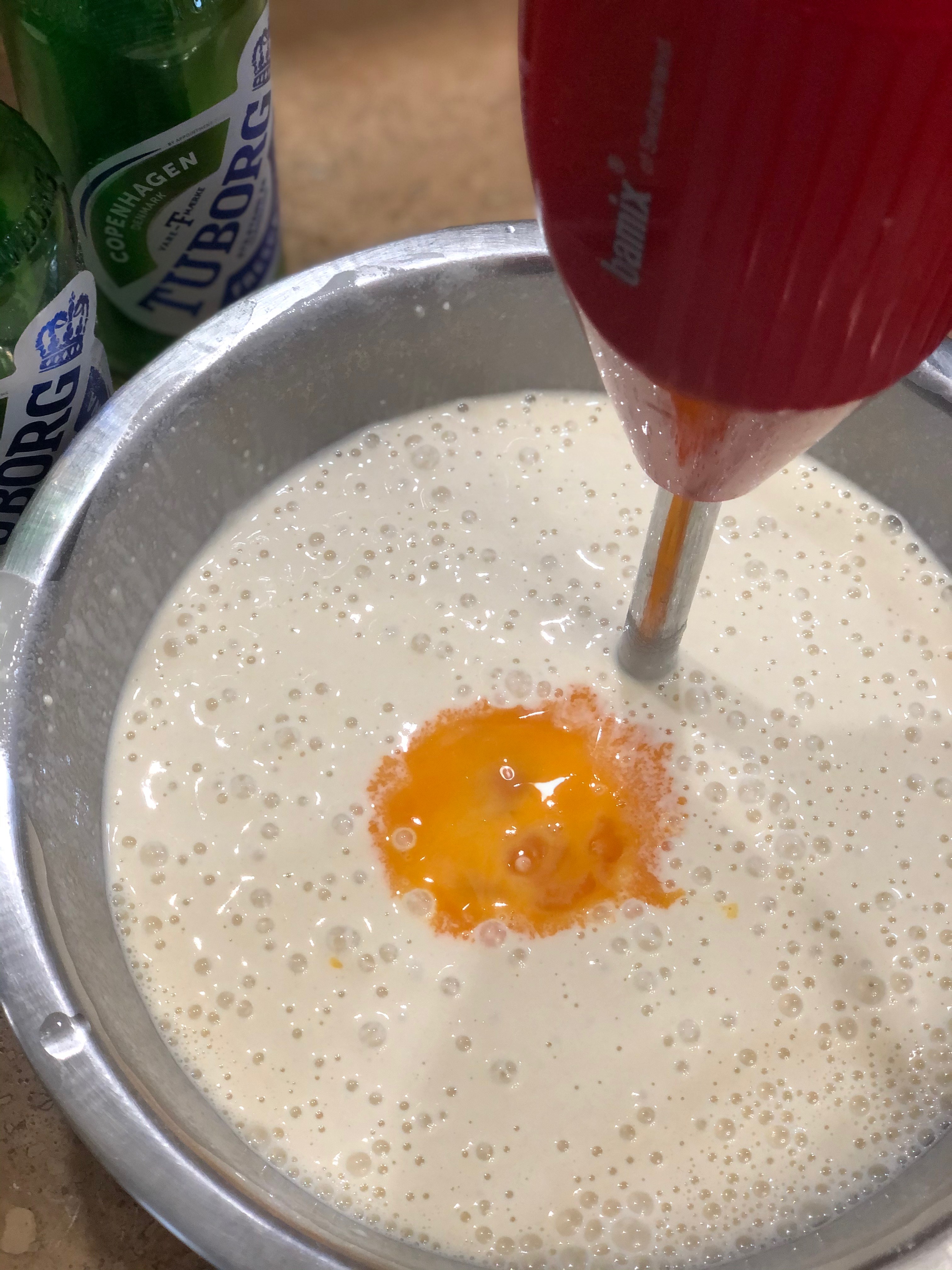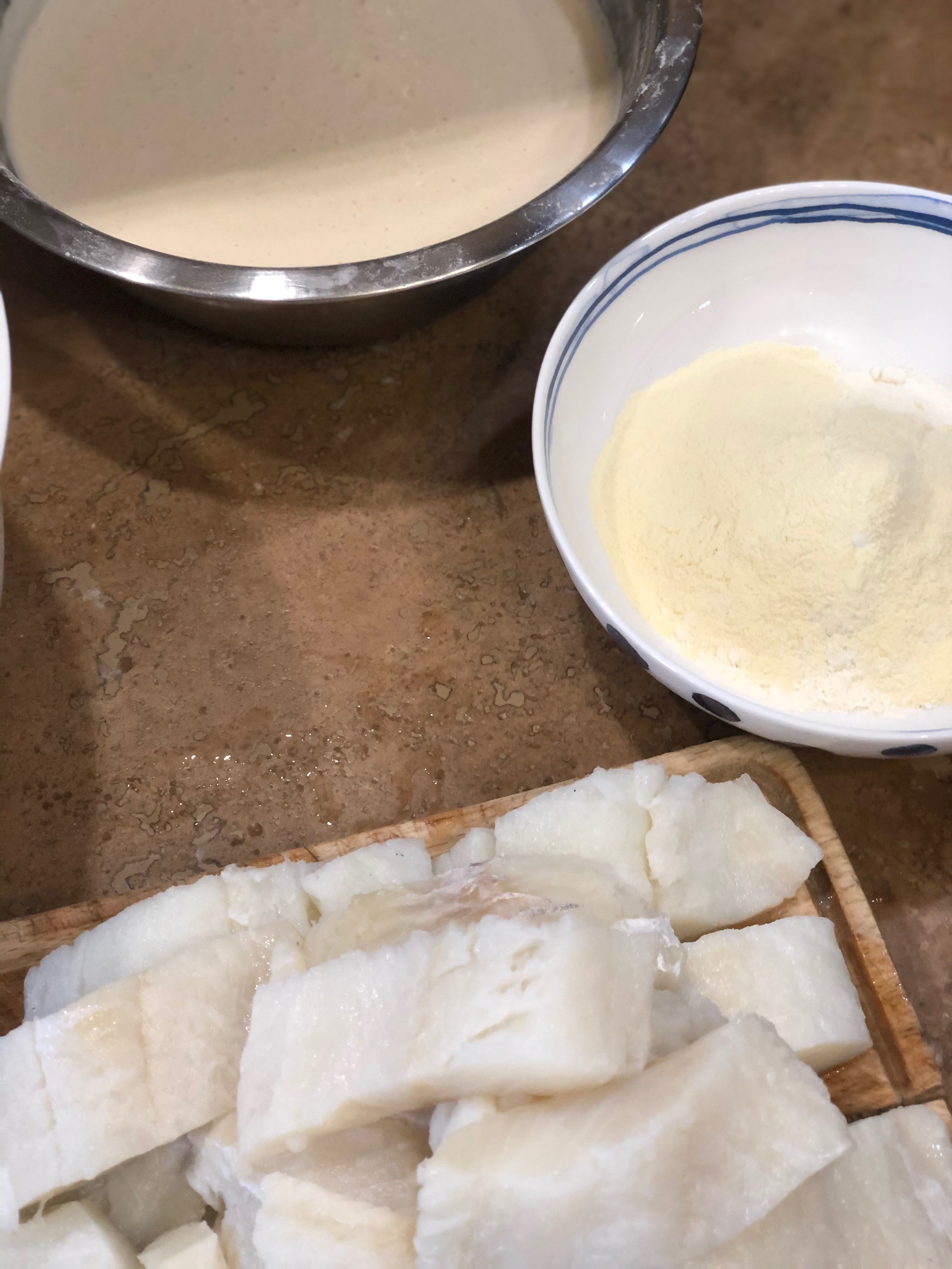 Spellate i pezzi di baccalà e, nel mentre, in una ciotola preparare la pastella amalgamando la birra alla farina aggiungendo il lievito sbriciolato.