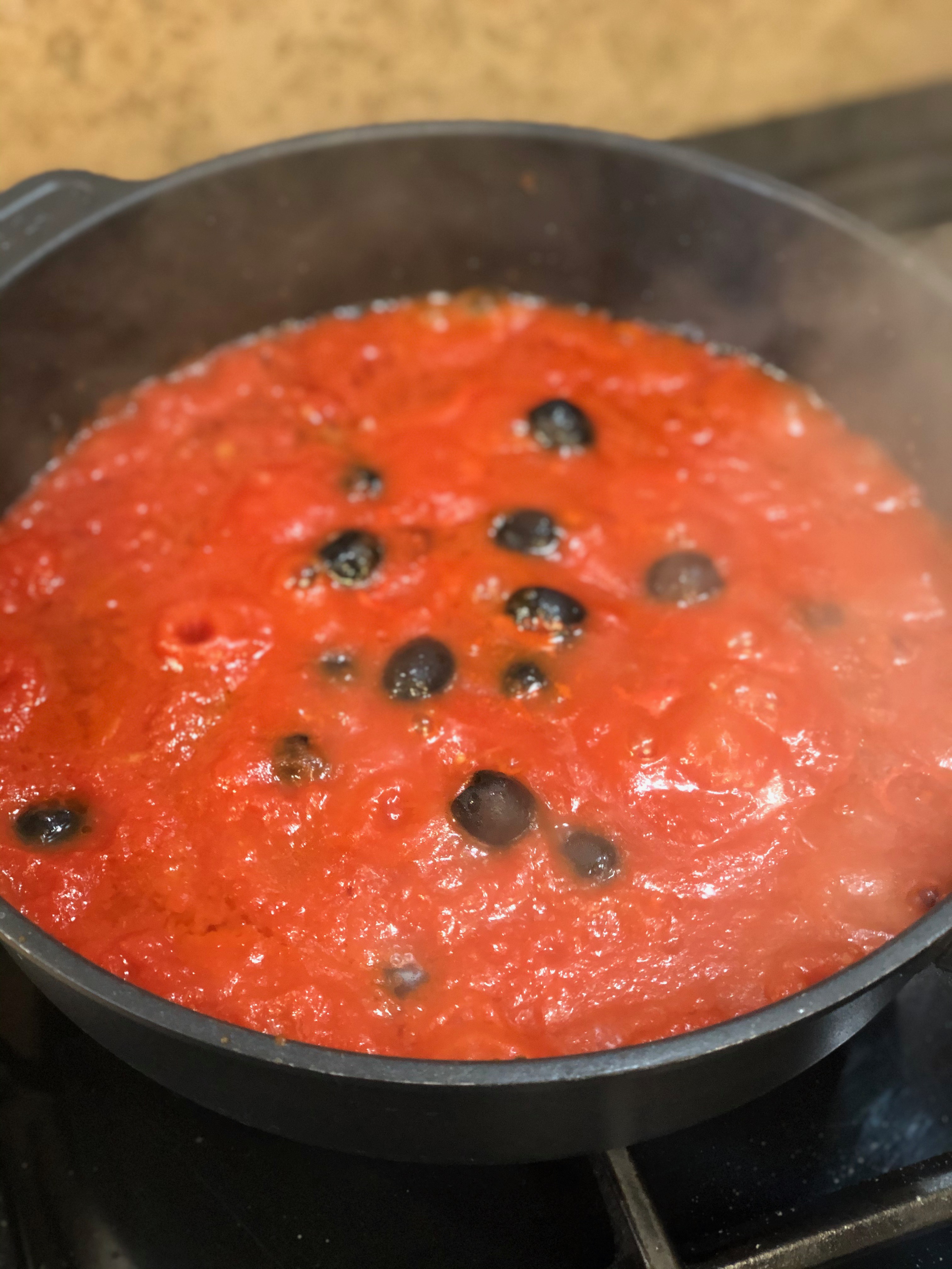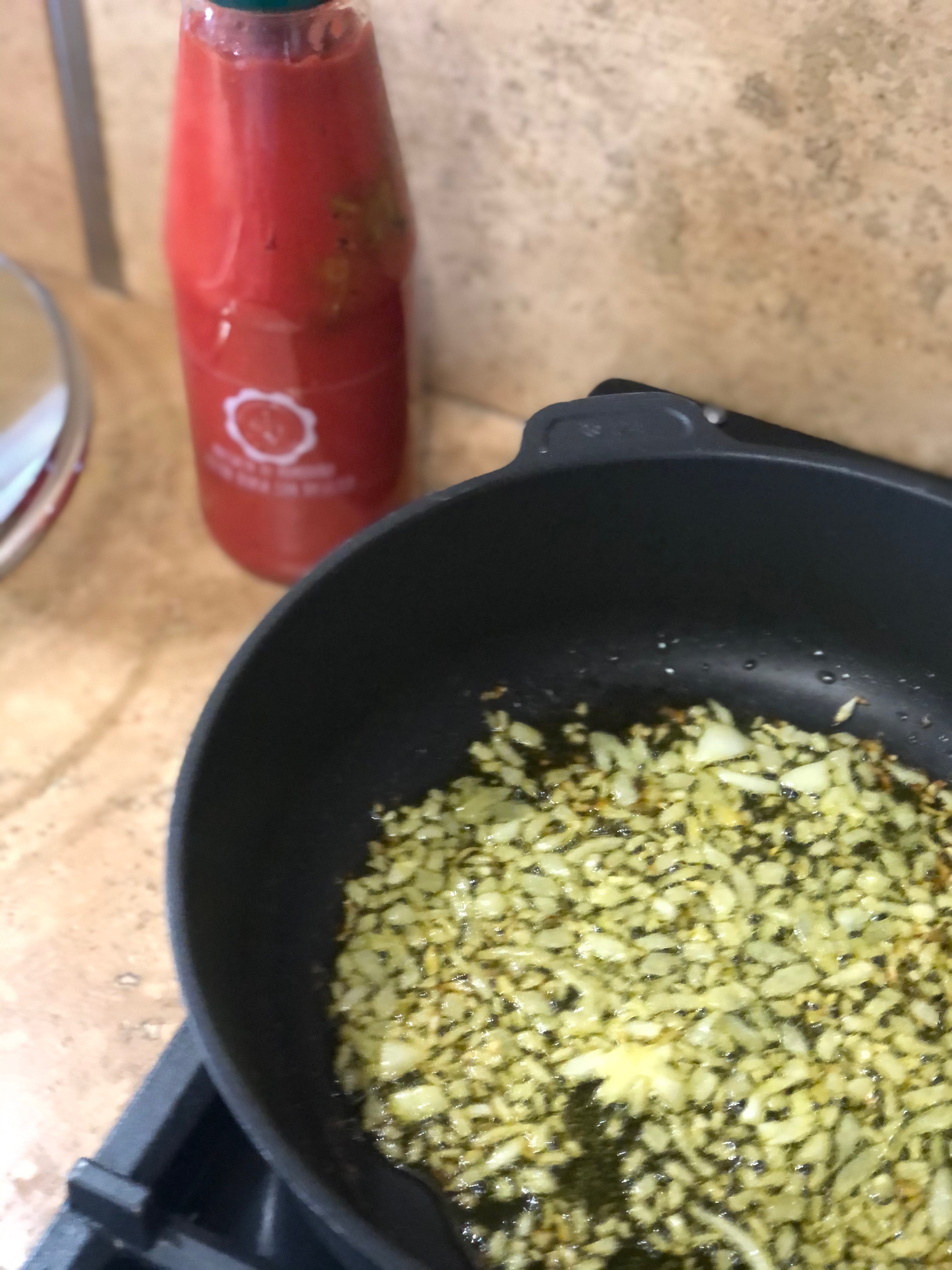 In un tegame aggiungere 4/5 cucchiai di olio evo, soffriggere la cipolla, aggiungere la passata di pomodoro e cuocere a fuoco medio per 30 minuti, aggiungere le olive, salare leggermente e unire il peperoncino a piacere, se dovesse risultare troppo asciutto aggiungere acqua poco alla volta.