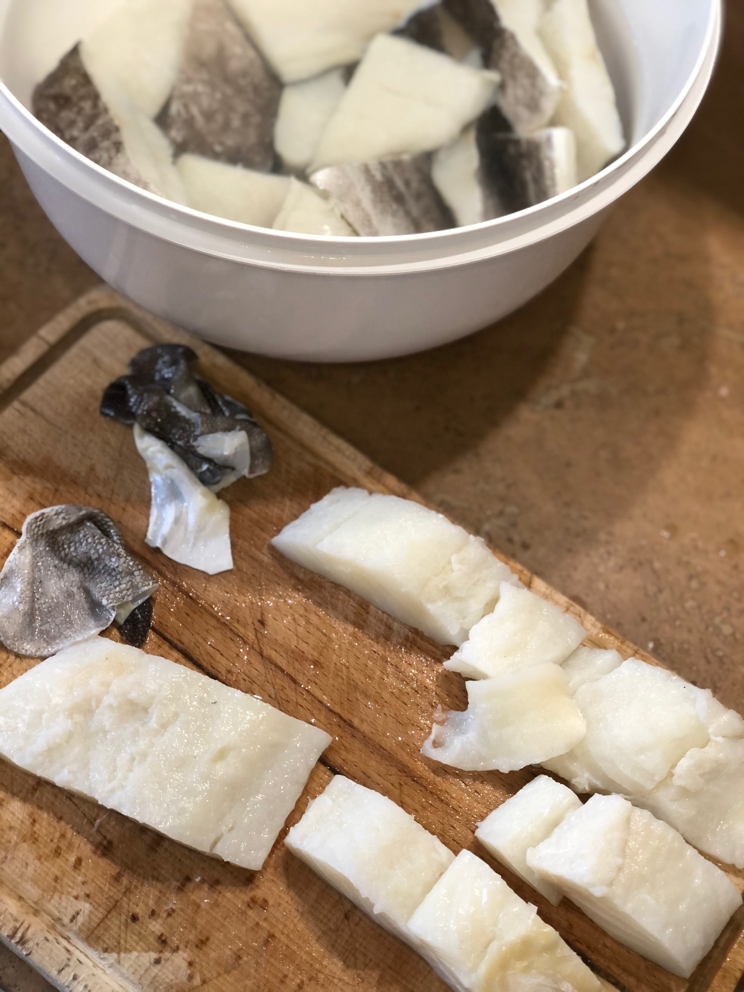 Mettere in ammollo il baccalà tagliato a pezzi per due giorni cambiando l’acqua più volte per eliminare il sale.