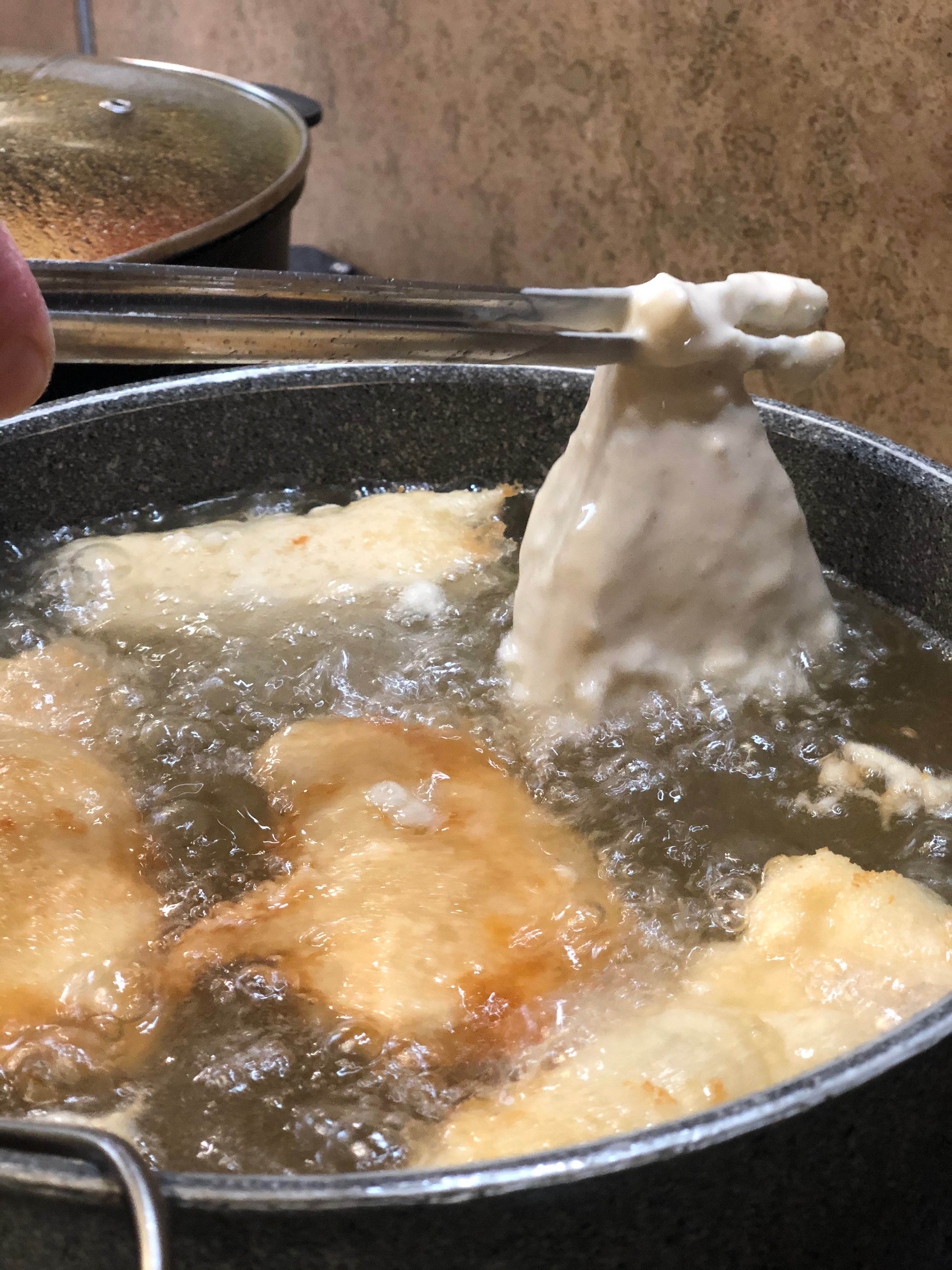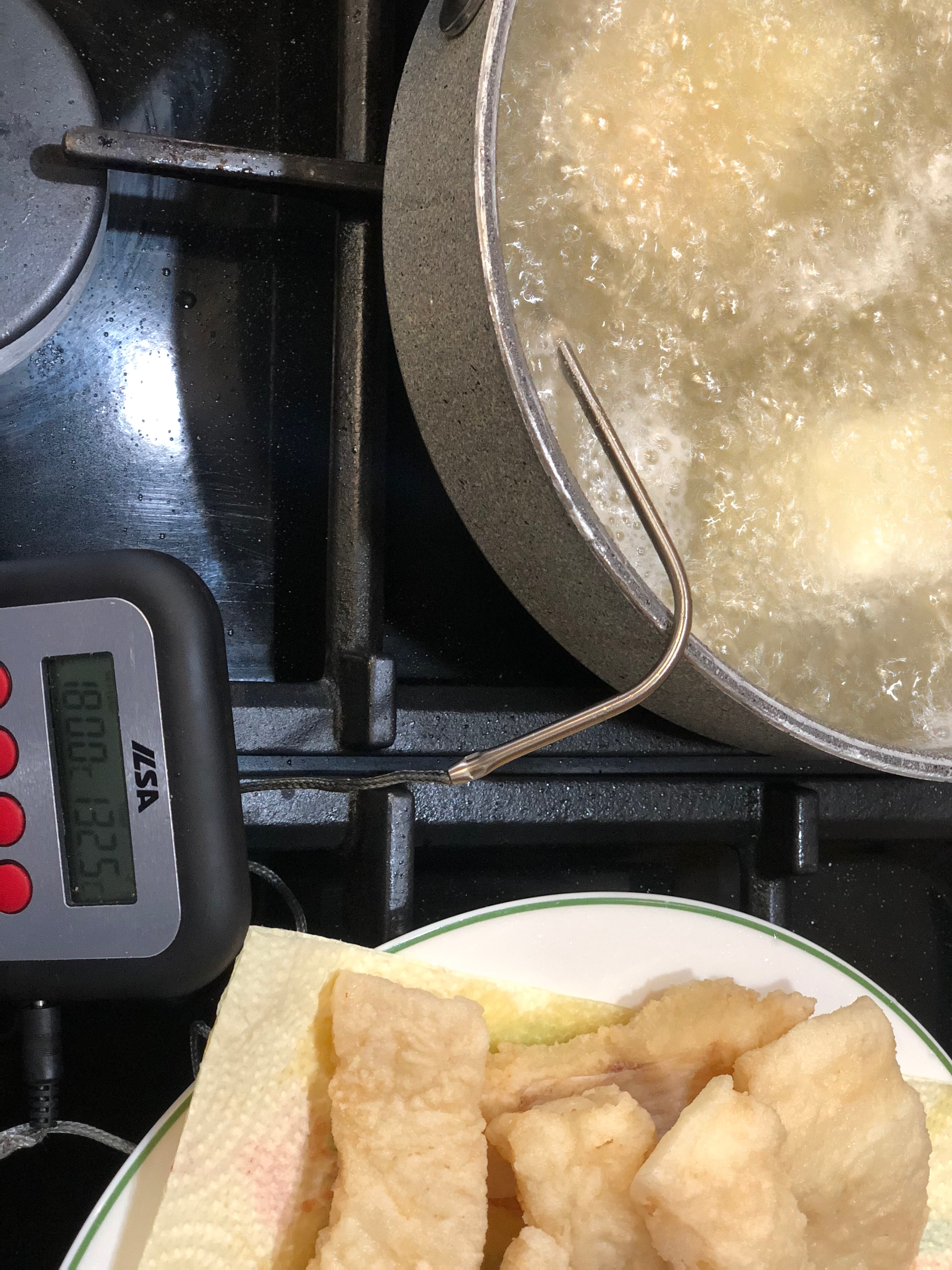 Riscaldare l’olio per friggere, portarlo a 180° e friggere i pezzi di baccalà infarinati (già spellati).