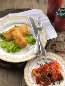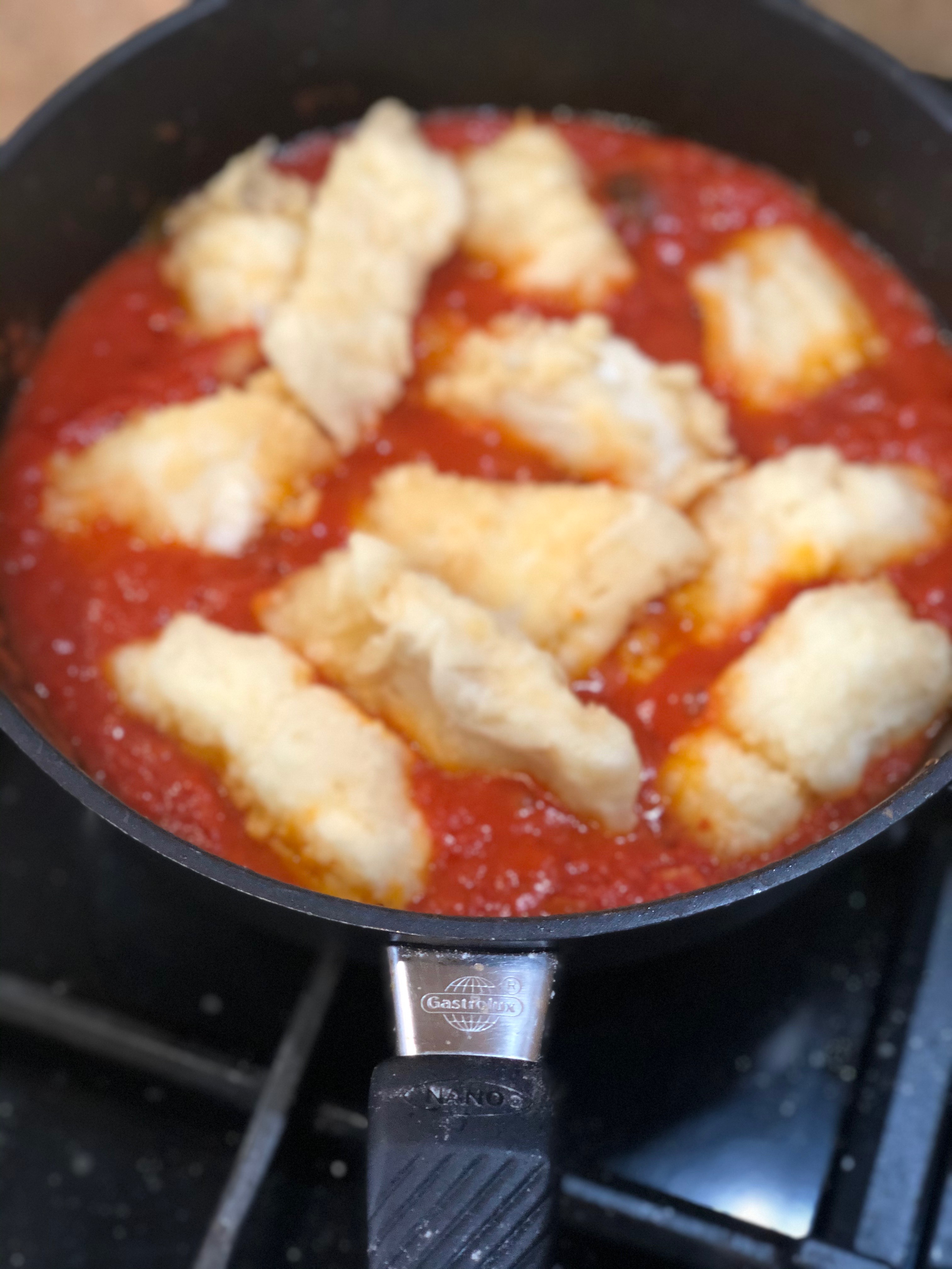 Adagiate nel tegame con il pomodoro i pezzi di baccalà precedentemente fritti, insaporire a fuoco medio e servire.