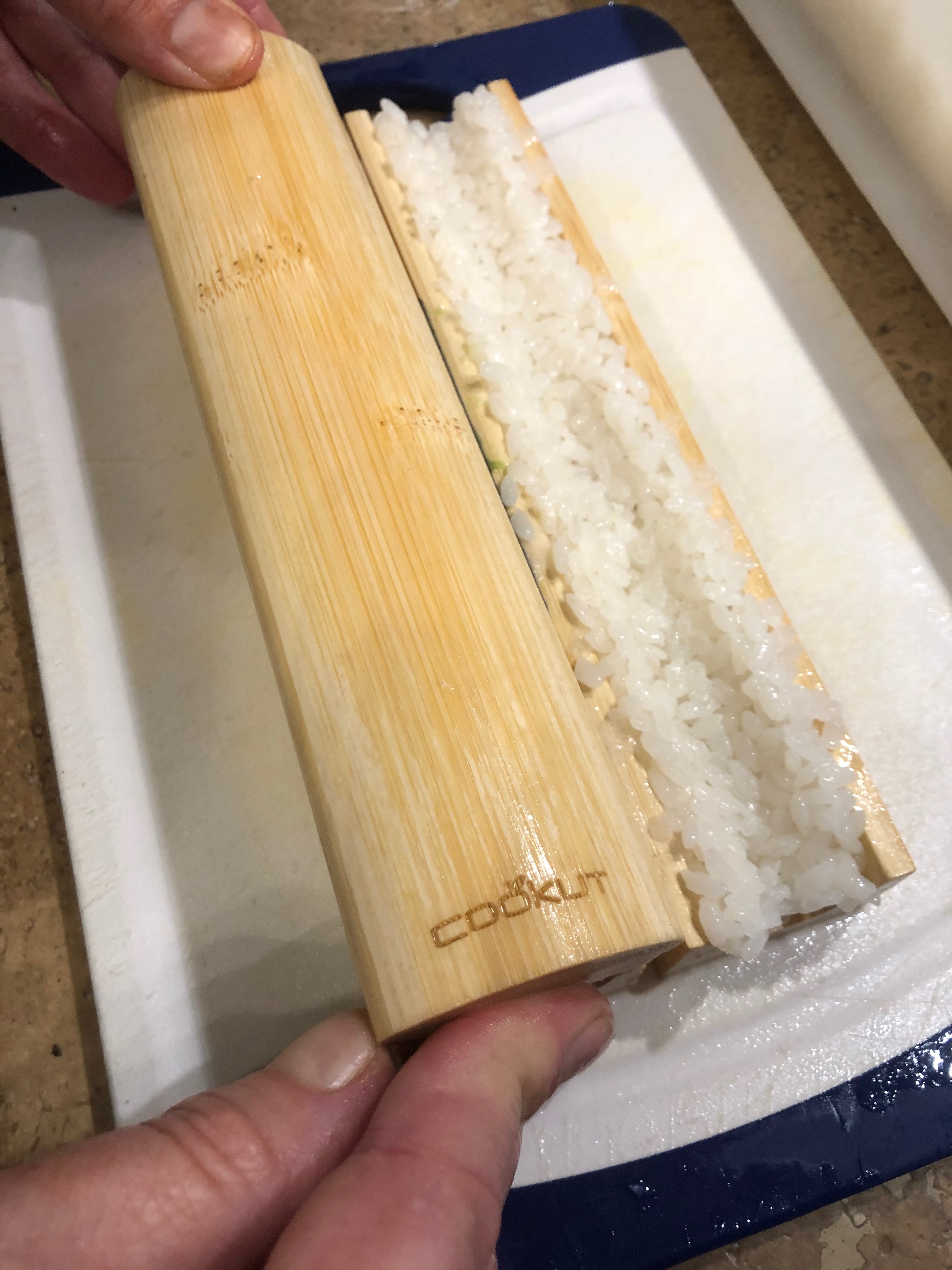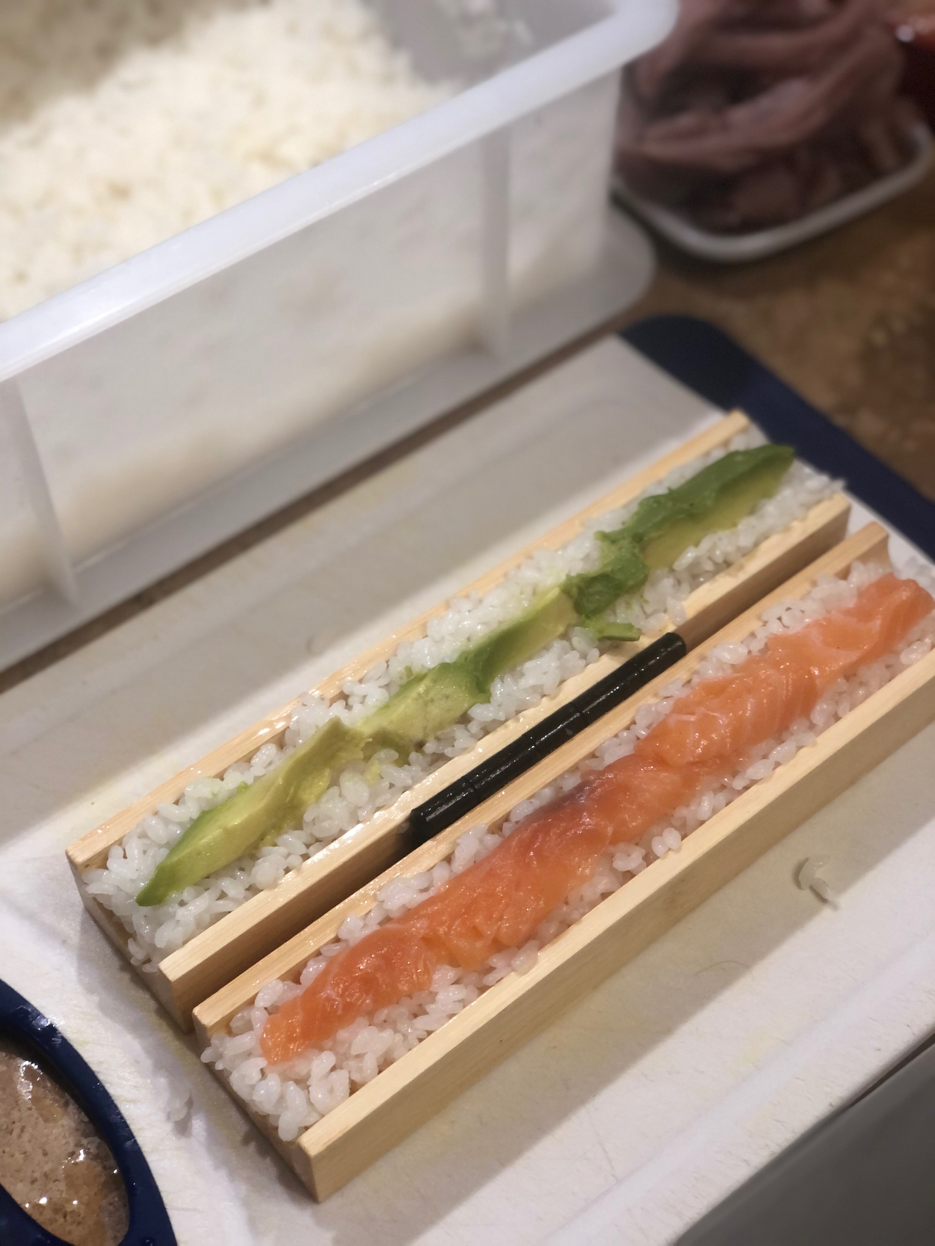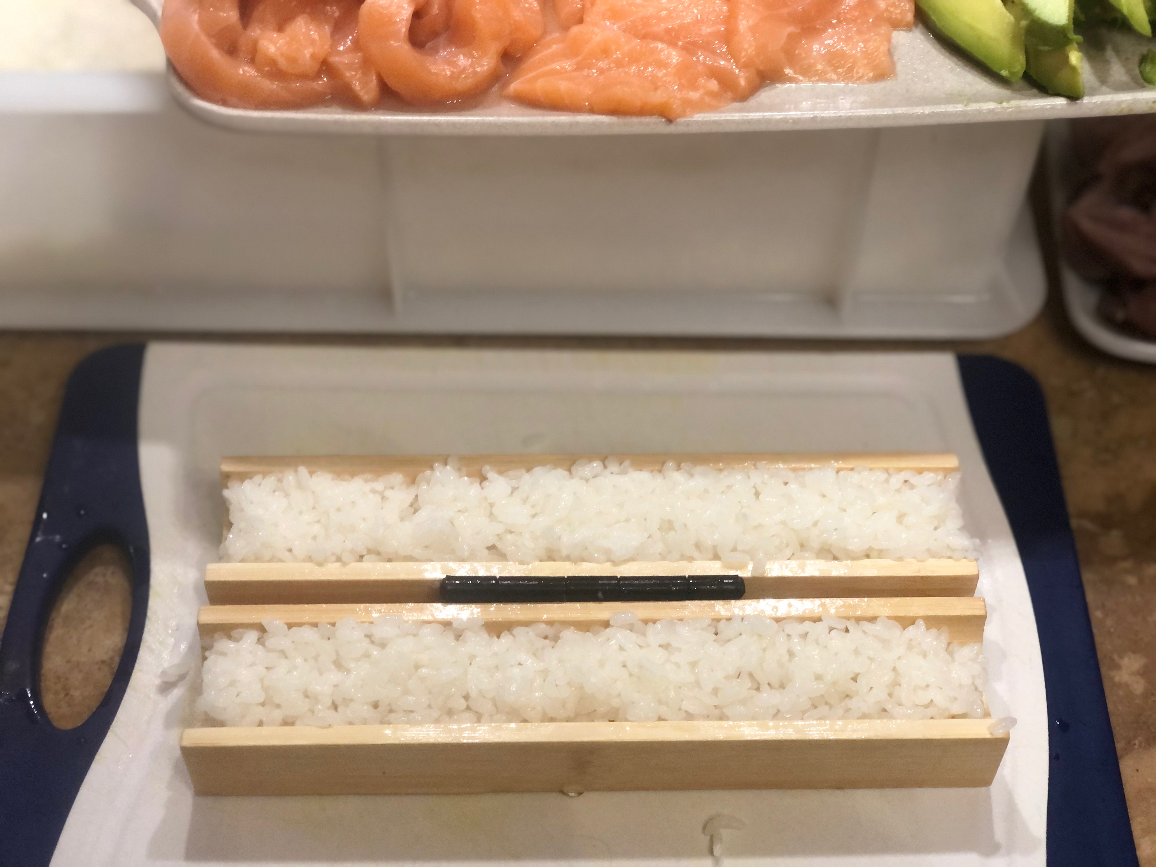 La pressa per compattare il riso e creare il solco per gli ingredienti, aggiungere a piacere salmone, avocado etc.