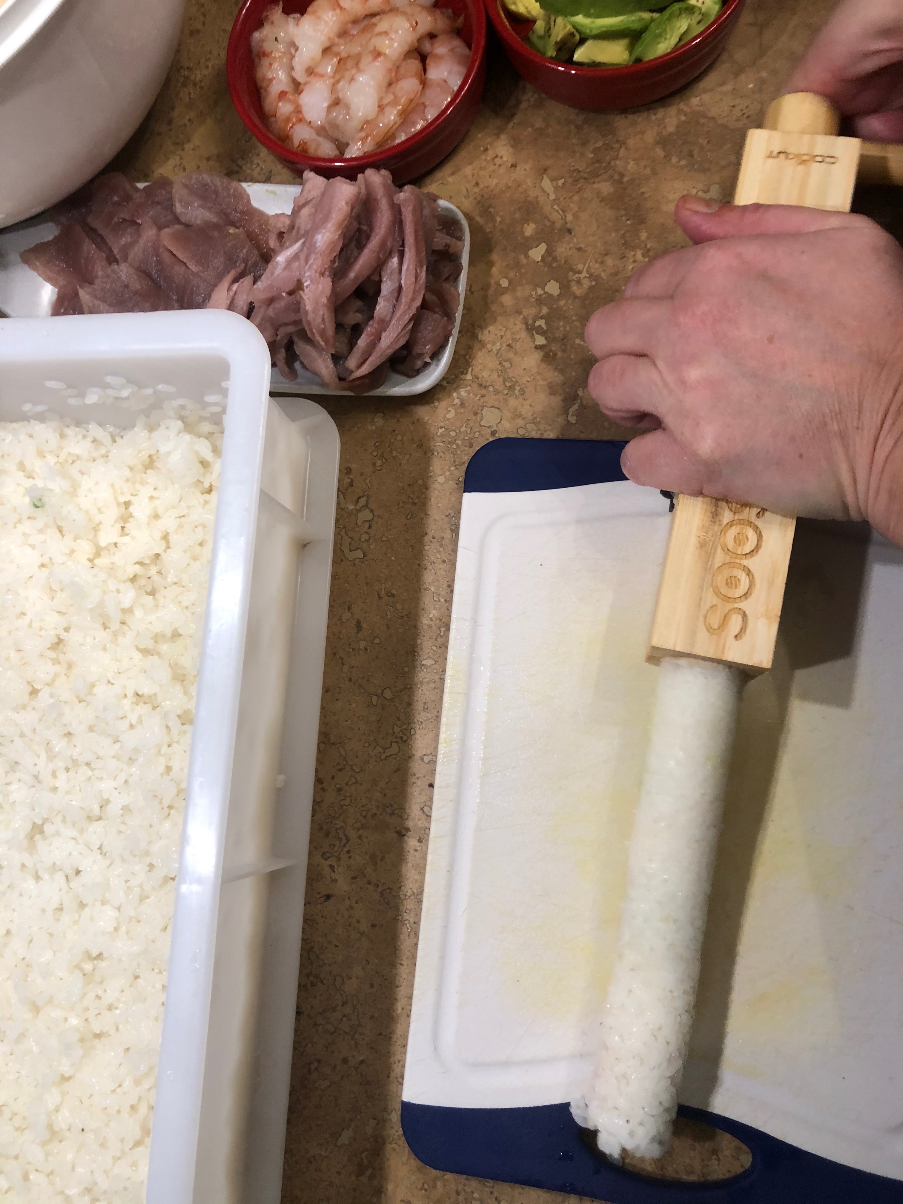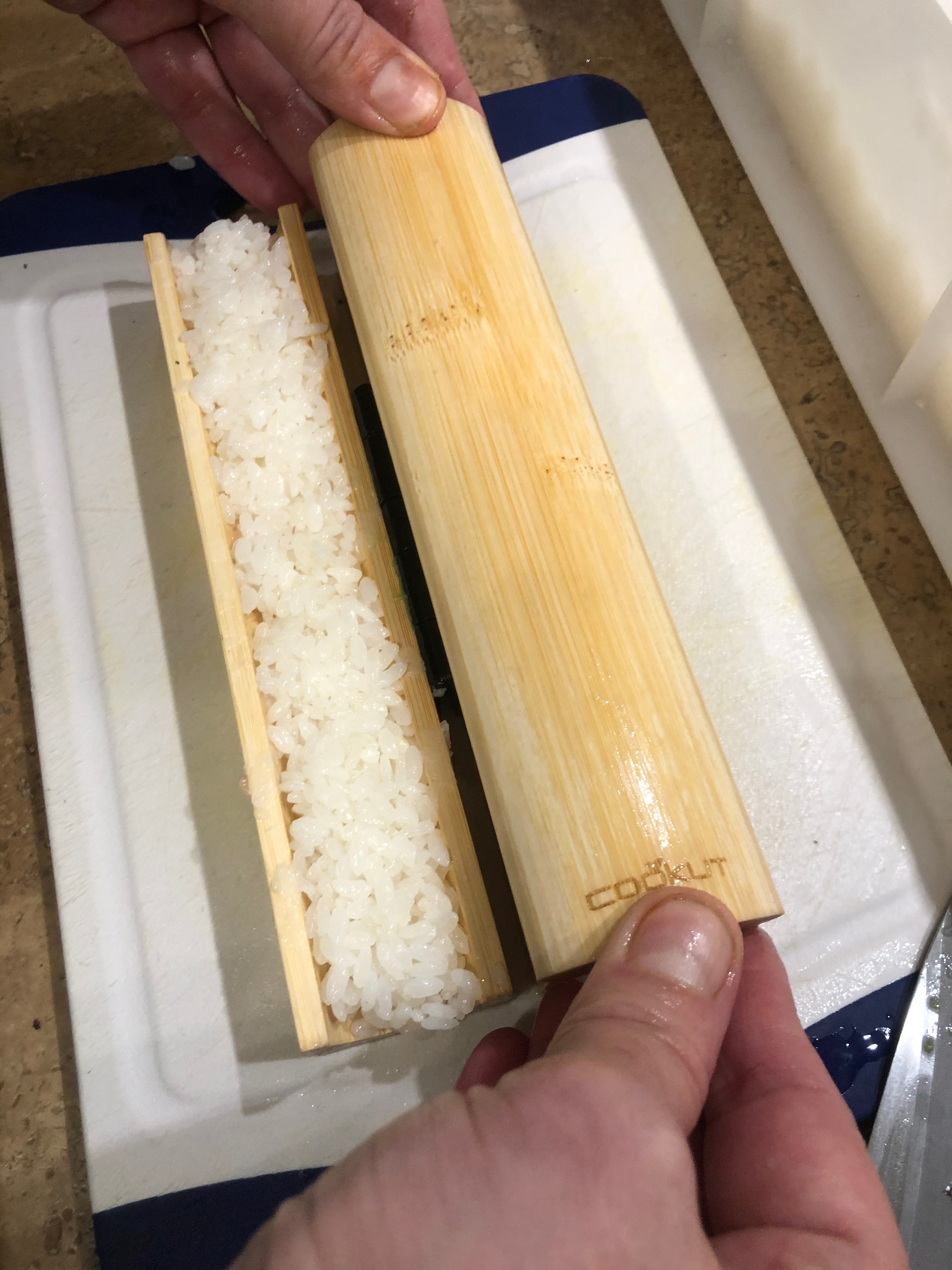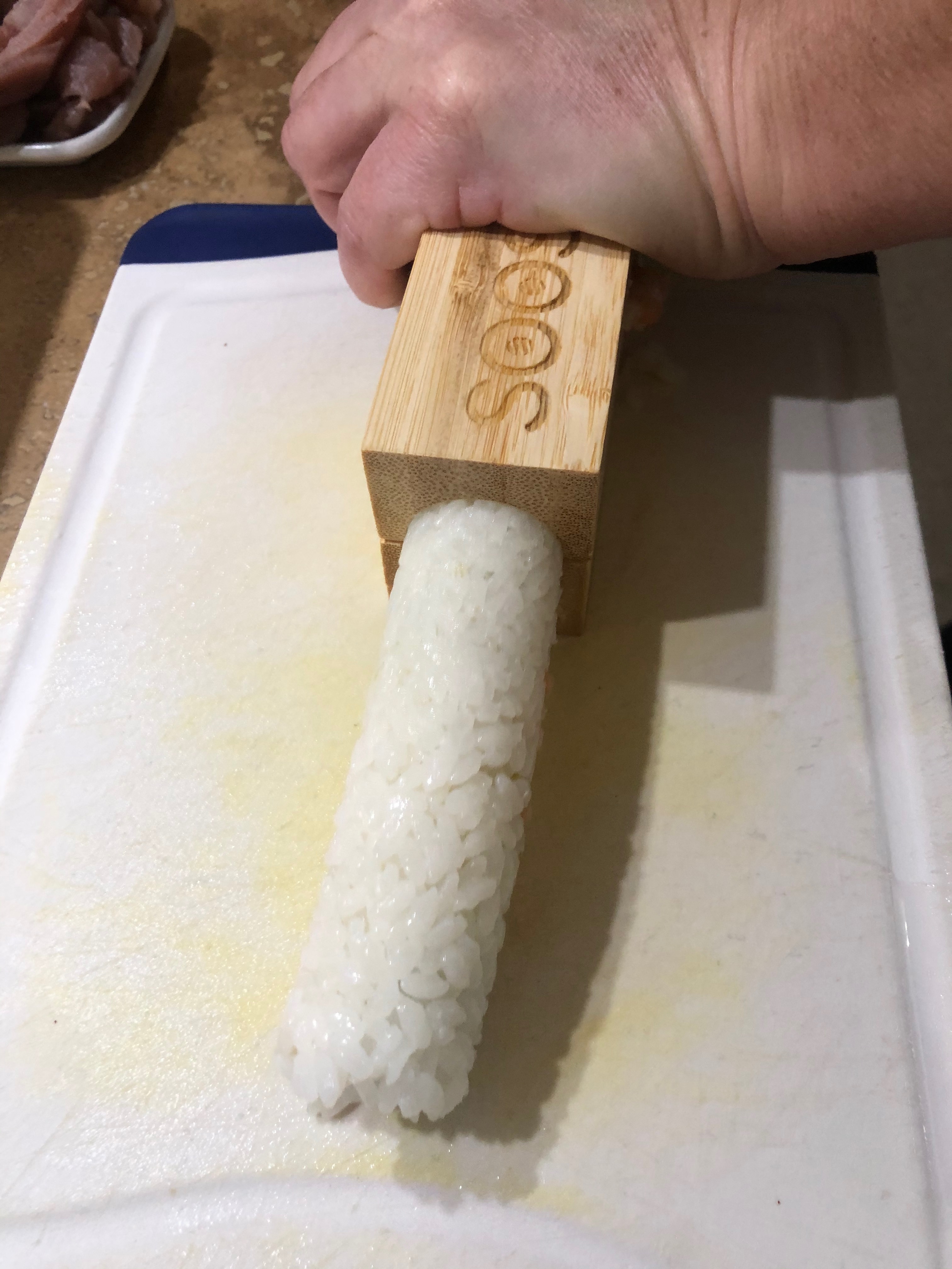 La pressa per compattare il riso e creare il solco per gli ingredienti, aggiungere a piacere salmone, avocado etc.