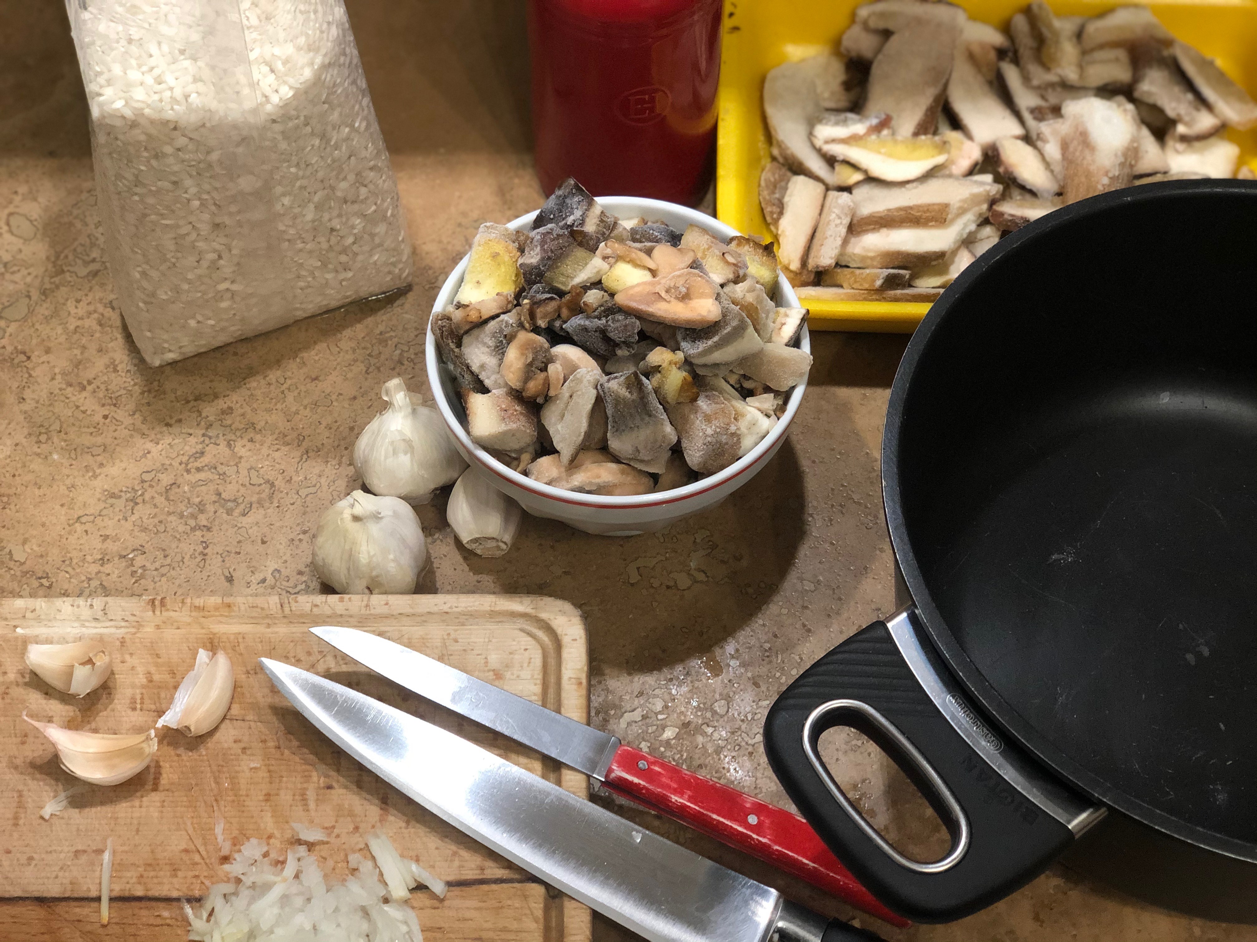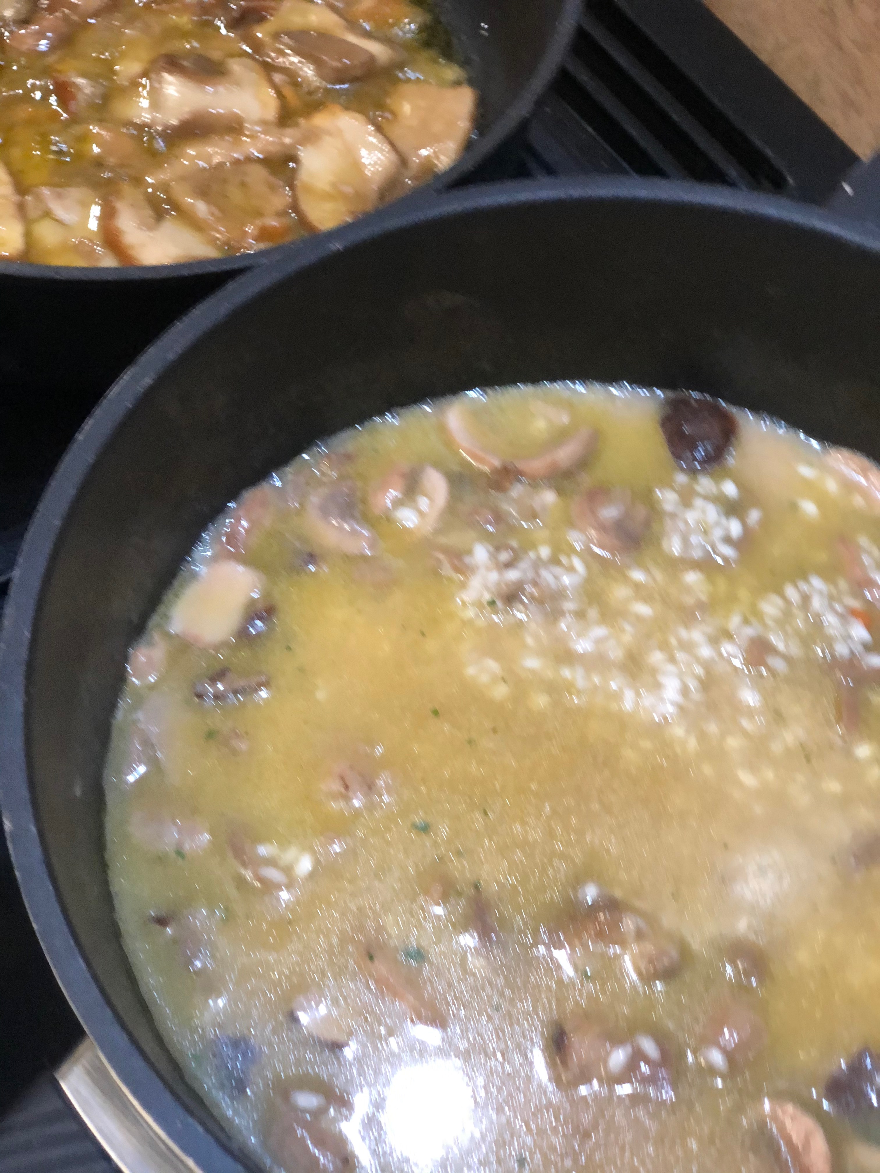 Tritare finemente la cipolla, farla appassire dolcemente a fuoco medio, aggiungere i funghi, insaporire ed aggiungere il riso, facciamo tostare fino a che il riso diventerà traslucido.