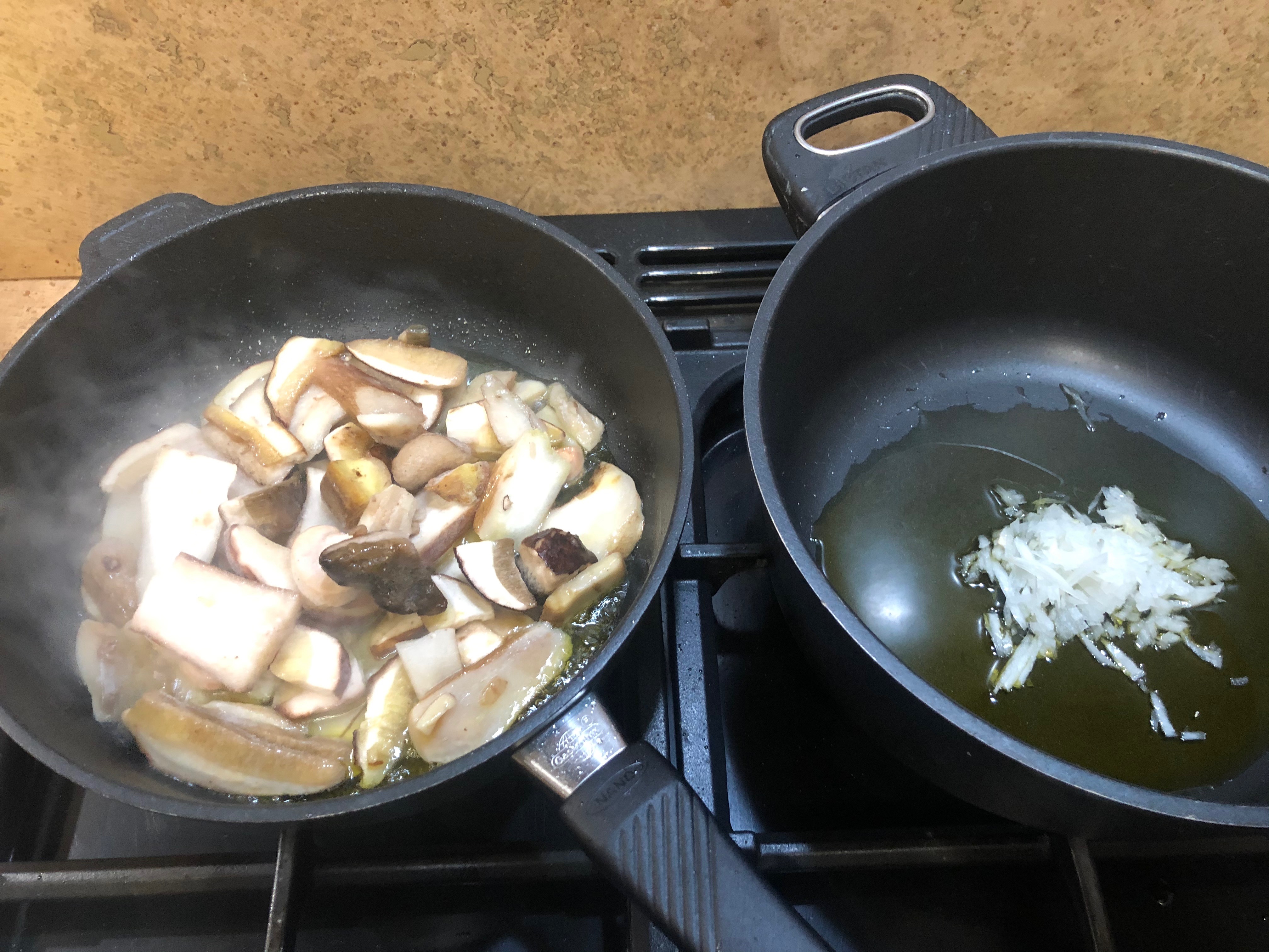 In un tegame soffriggere uno spicchio d’aglio fino a che non sarà dorato, toglierlo ed aggiungere metà dei funghi, cuocerli a fuoco medio, aggiungere sale pepe.