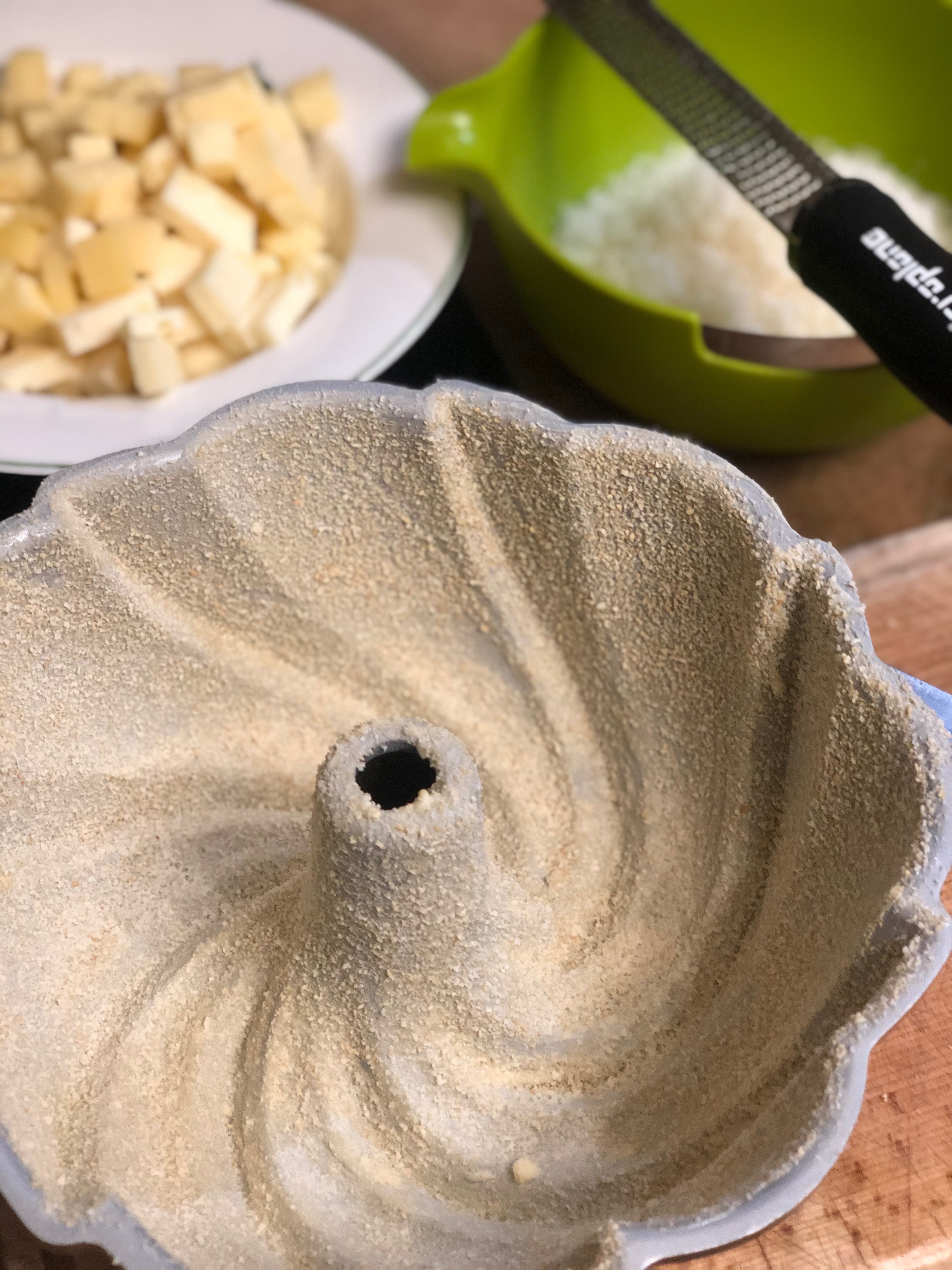 Imburrare lo stampo e cospargere con pane grattuggiato.