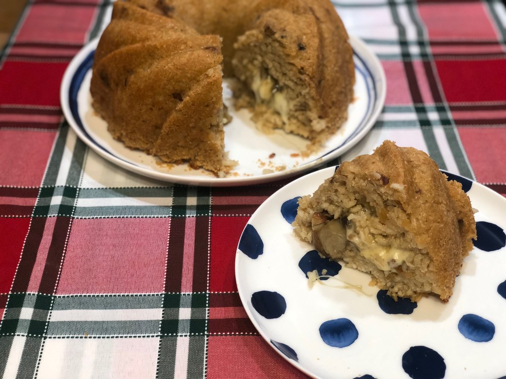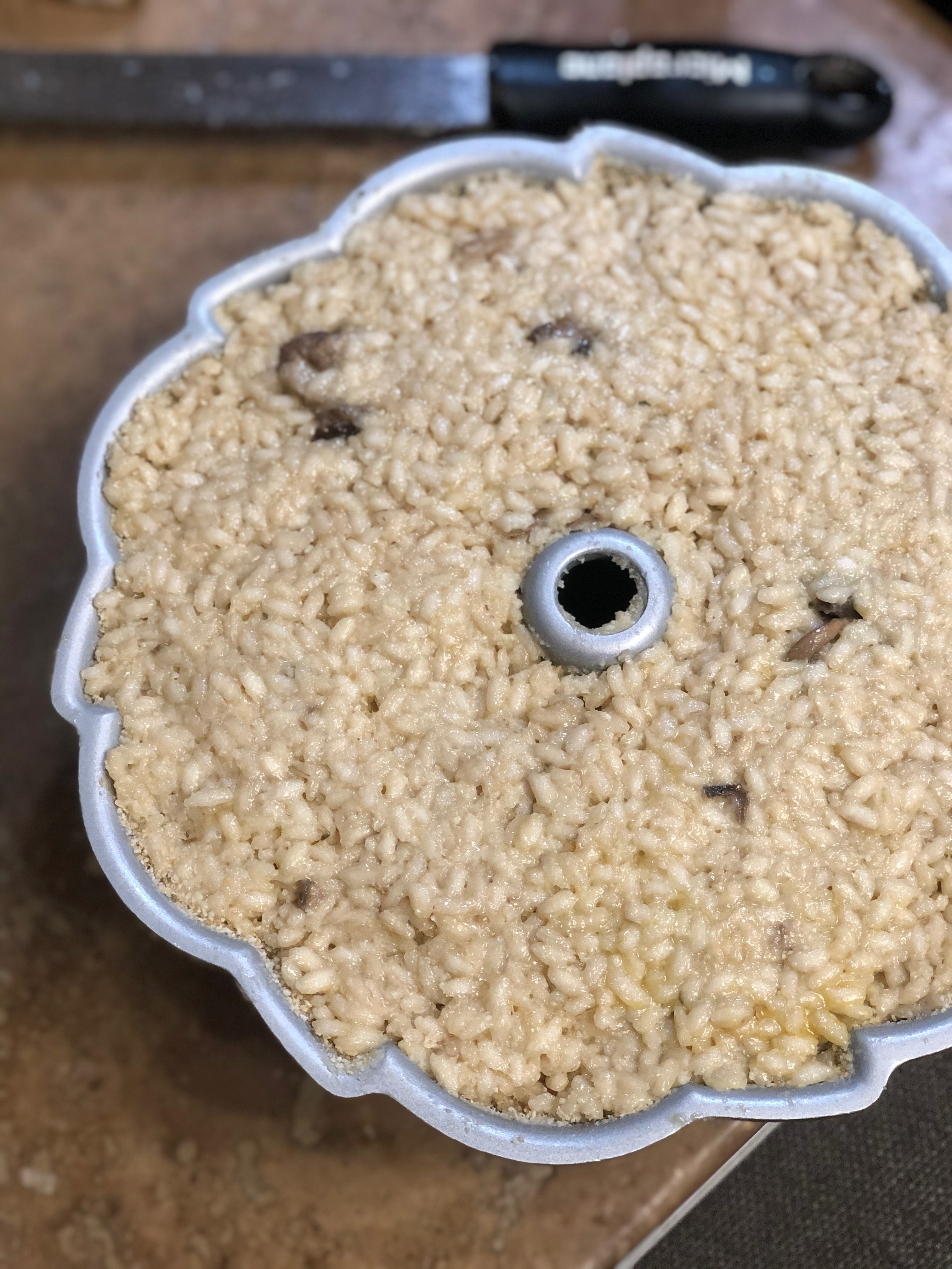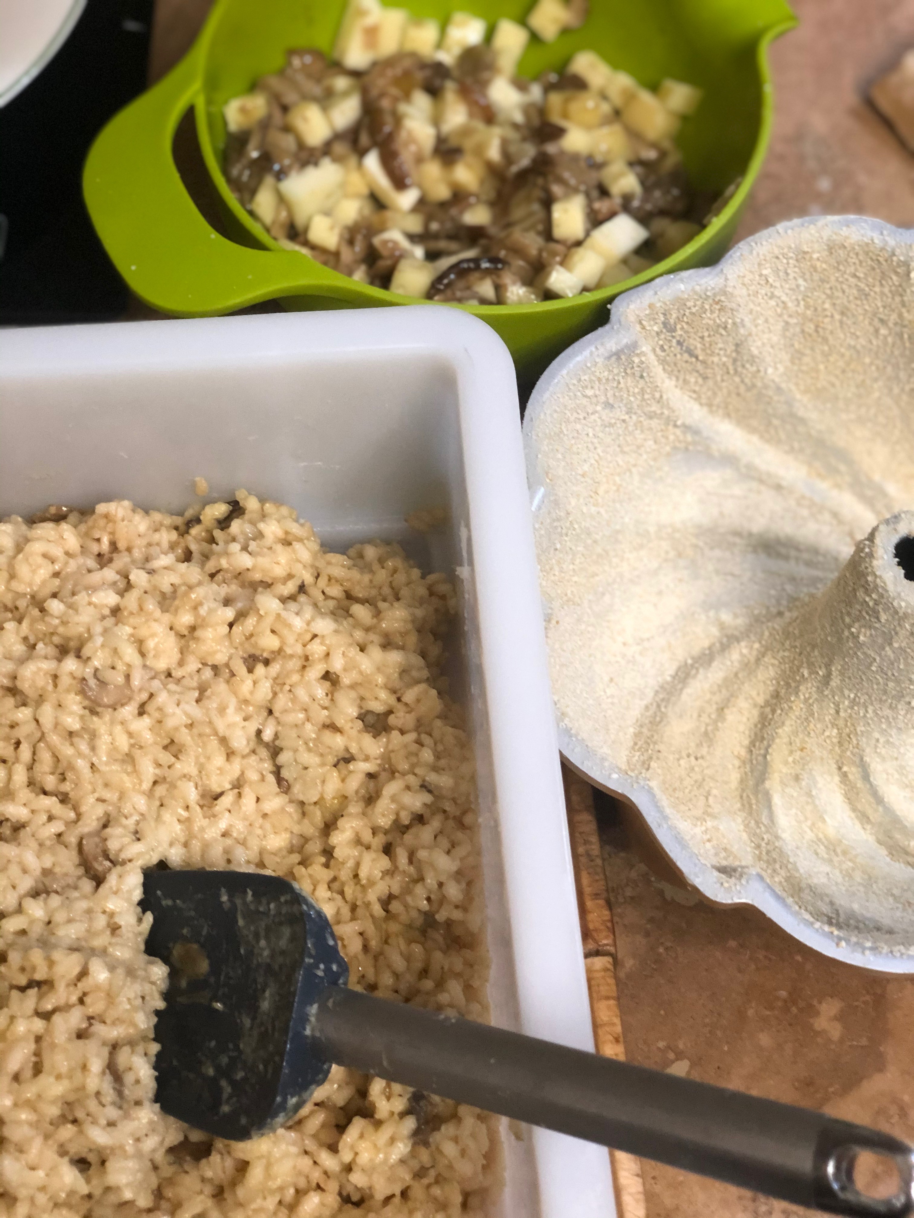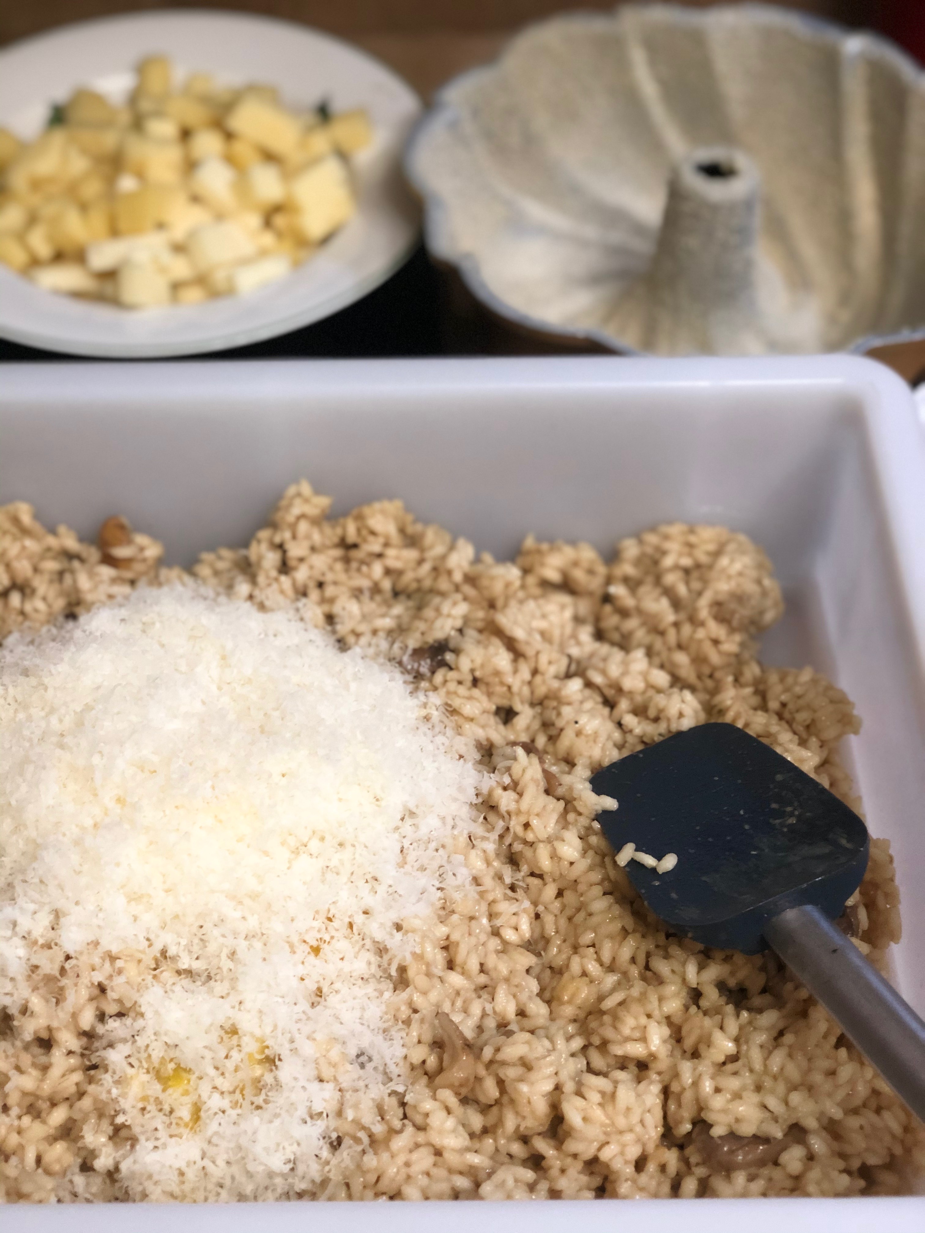 Versare una parte del riso rendendo concava la parte centrale, unire al centro funghi e formaggio.