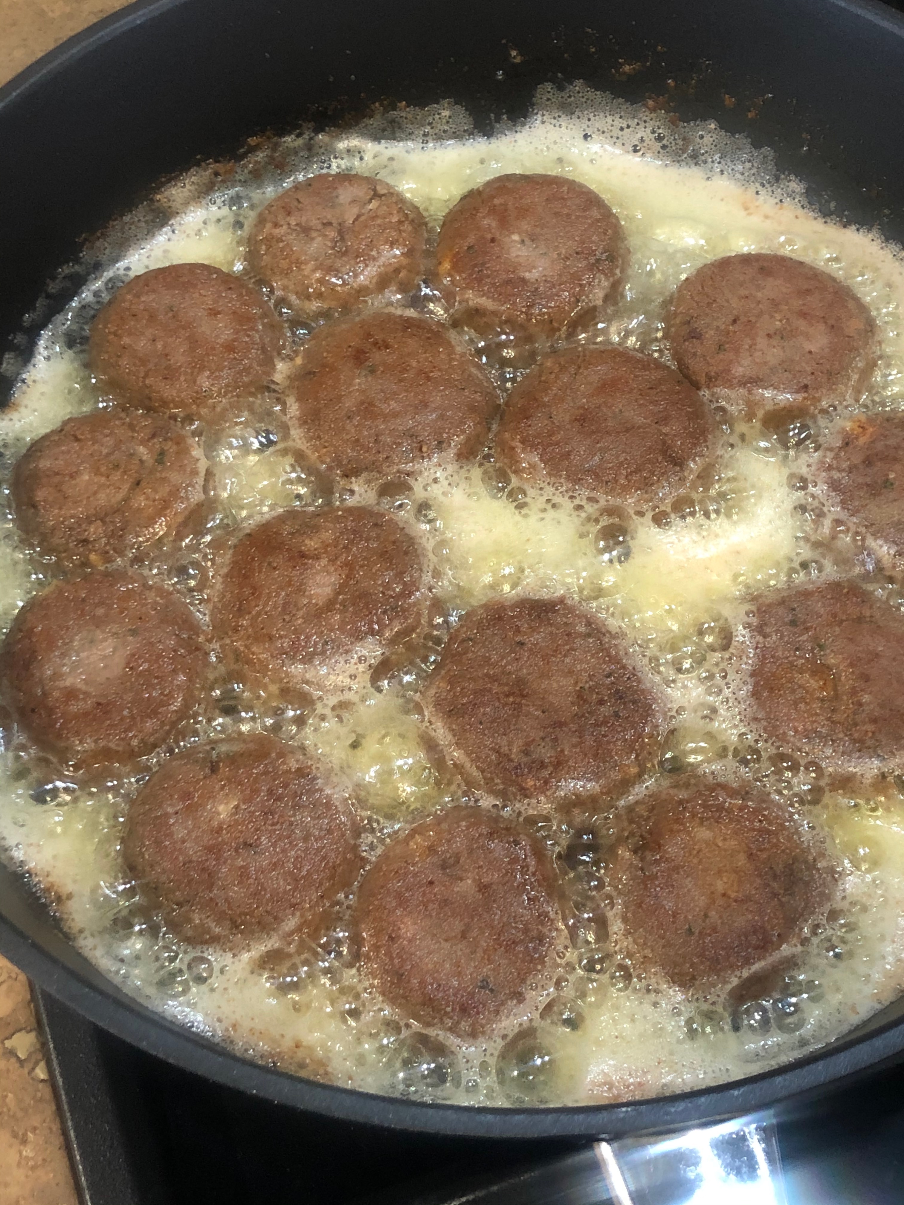 Adagiare nel tegame le polpette e cuocere per 2/3 minuti per parte rigirandoli con l’aiuto di due cucchiai.