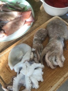 Pulire e lavare il pesce, tagliare il polpo a pezzettini.