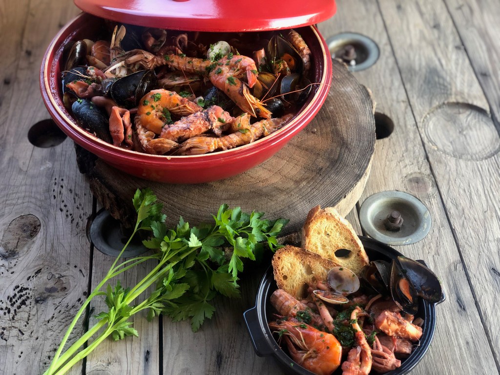 La zuppa di pesce, servita con due fette di pane tostato diventa un saporitissimo piatto unico.
