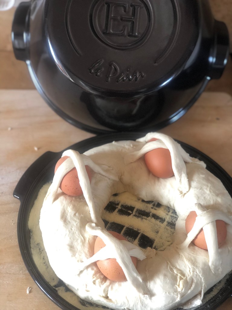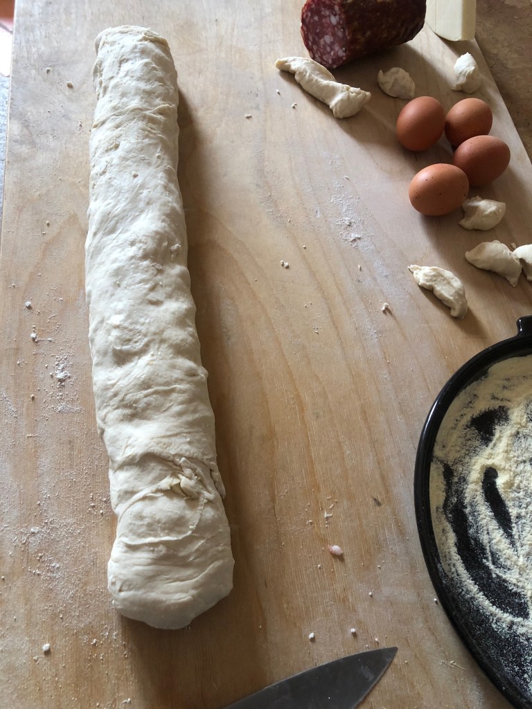 Riprendete l’impasto, stendetelo formando un rettangolo, farcite con salame e formaggio, arrotolate con delicatezza, posizionate nella base del cuocipane, formando una ciambella, fate riposare per 30 minuti, posizionate le uova e ricoprite con due filoncini di pasta, che avrete tenuto da parte.