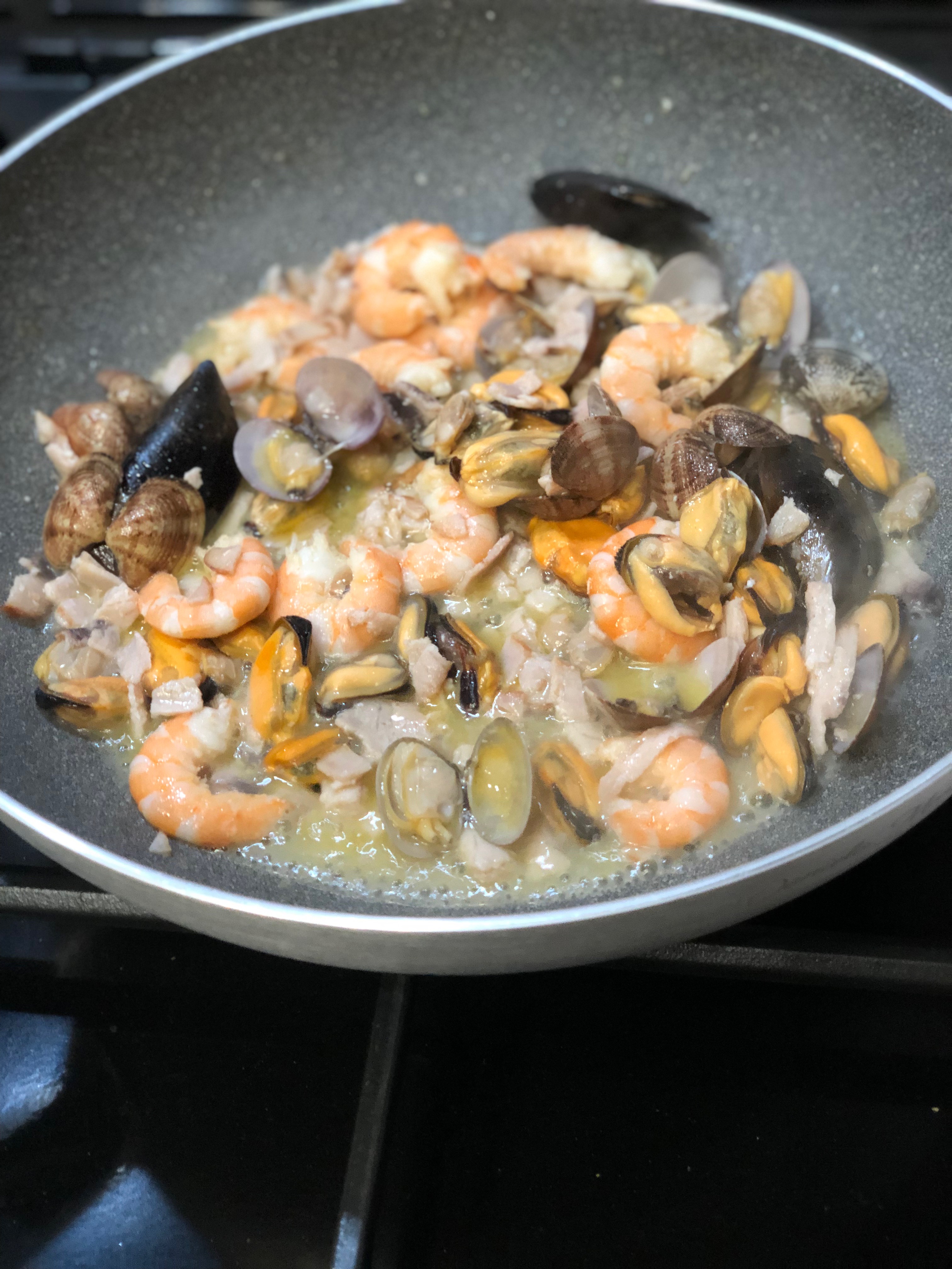 Nella padella aggiungete due cucchiai di olio e rosolate il pesce spada tagliato a cubetti, aggiungete le mazzancolle, cuocete per due minuti e ,infine, completate con cozze e vongole.