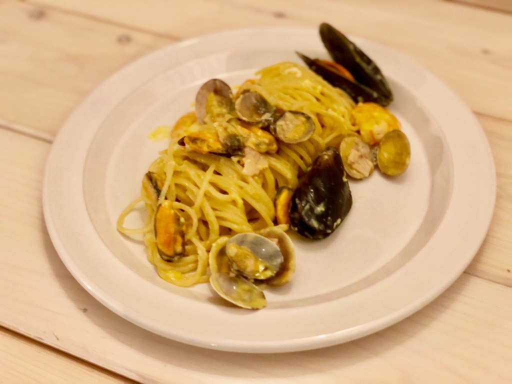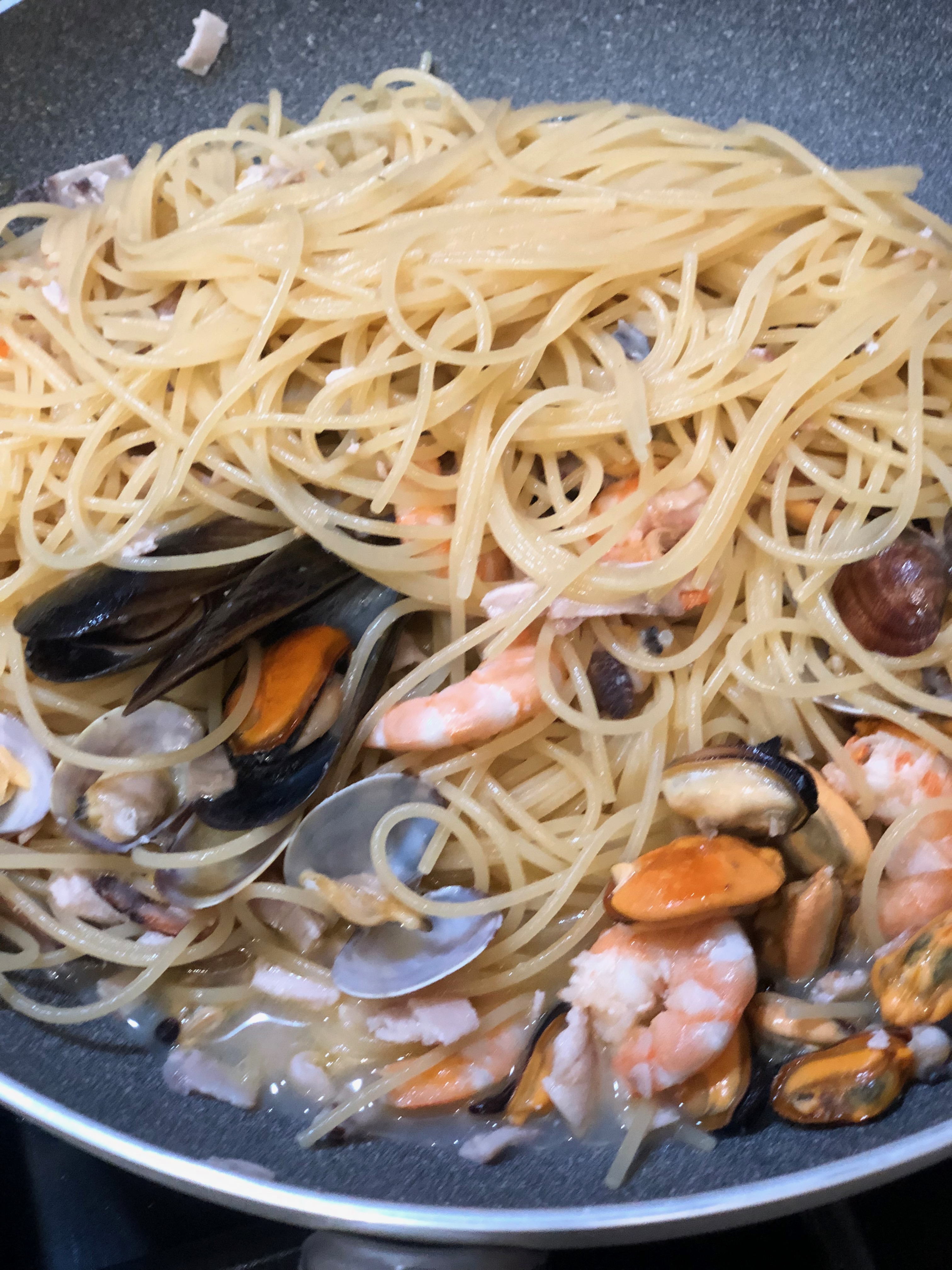 Scolate la pasta al dente e ripassate in padella con il pesce e il liquido delle cozze.