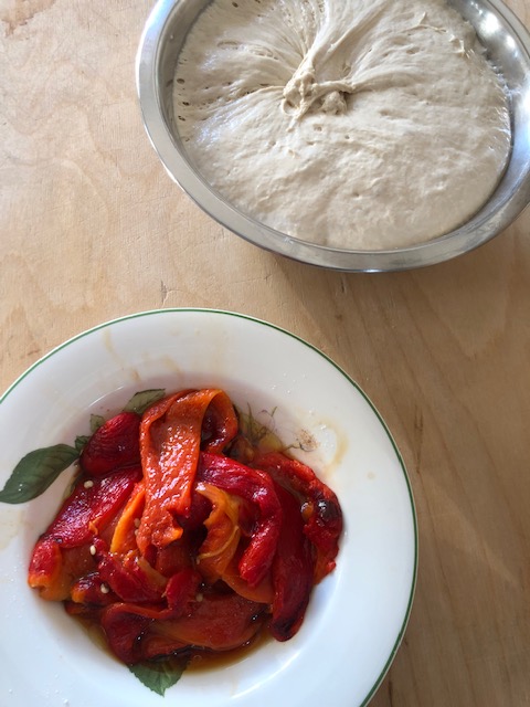 Procedere con la pezzatura del pane, stenderlo a fazzoletto , distribuire i filetti di peperoni ed arrotolare