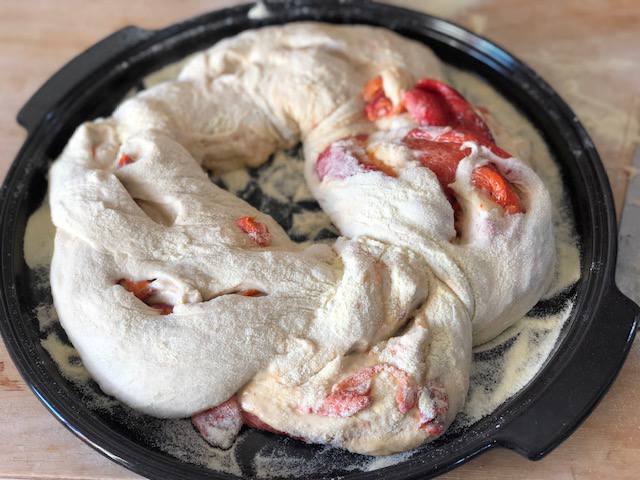 Infarinare la base dello stampo, posizionare l’impasto a corona chiudere lo stampo e far lievitare per 30 minuti, trascorso questo tempo incidere la superficie del pane .