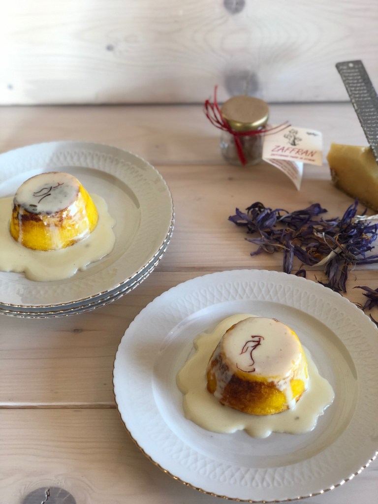 Sfornate il flan, terminate versando qualche cucchiaio di fonduta sul flan , aggiungete qualche pistillo per decorazione