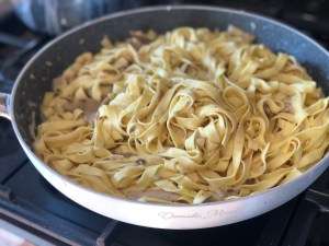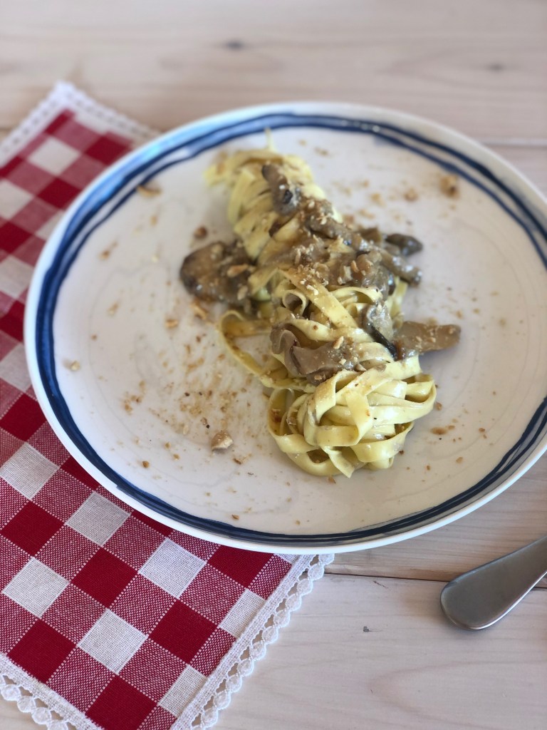Cuocete le tagliatelle per pochi minuti, scolateli e unite ai funghi , spadellate per qualche minuto e servite con una generosa spolverata di nocciole tritate