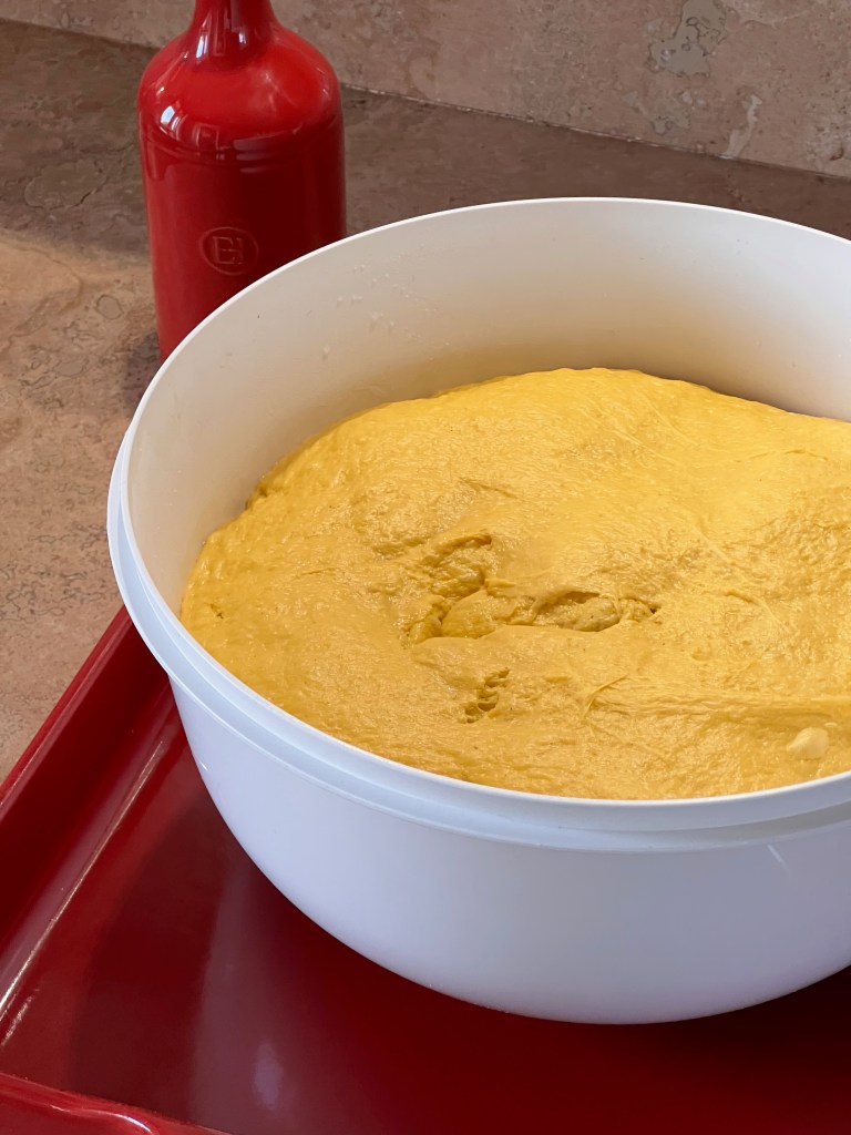 – In una ciotola capiente unite la farina con la zucca sminuzzata, l’acqua, l’olio, l’acqua con lievito e miele ed impastate, in fine aggiungere il sale
