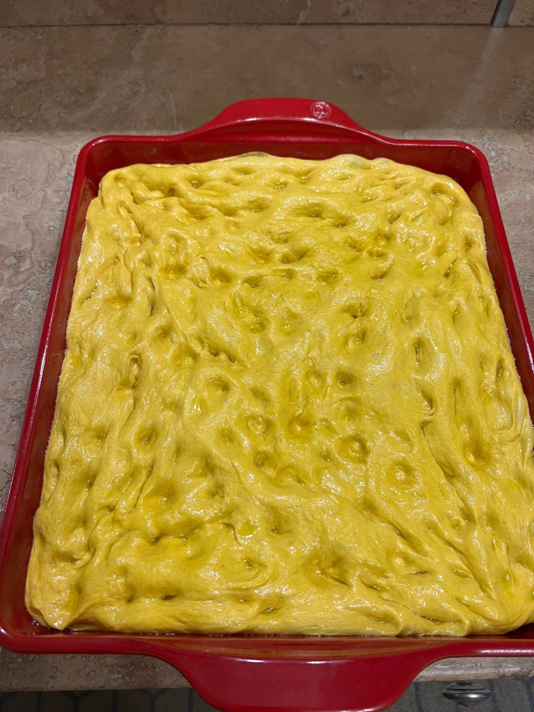 – Oliate abbondantemente una teglia rettangolare e stendete l’impasto fino a ricoprire completamente la teglia, stendete usando la punta delle dita