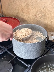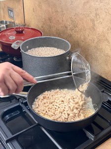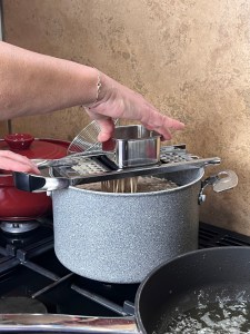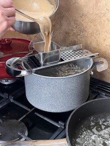 Portare a bollore una casseruola con acqua salata , posizionare sopra la casseruola apposito attrezzo per gli spatzle , versare il composto poco alla volta e scorrere avanti indietro facendo cadere delle grandi gocce nell’acqua.