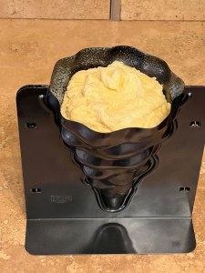 Aprire lo stampo ungere con staccante , richiudere lo stampo riempire con l’impasto