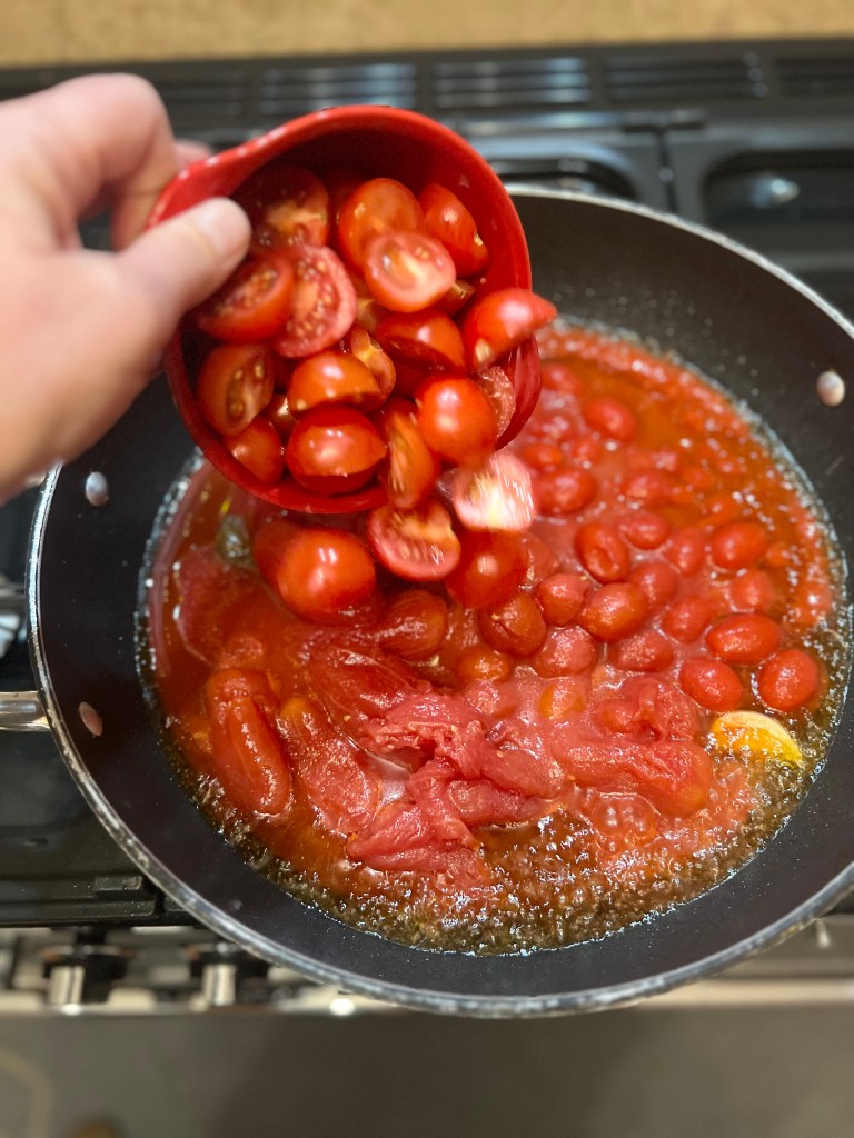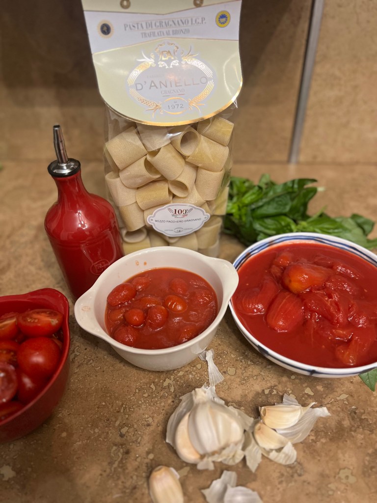 la ricetta famosa in questione prevede tre tipi di pomodoro in base alla stagione , chiaramente io ho utilizzato pomodori in scatola piu dei pomodorini freschi.