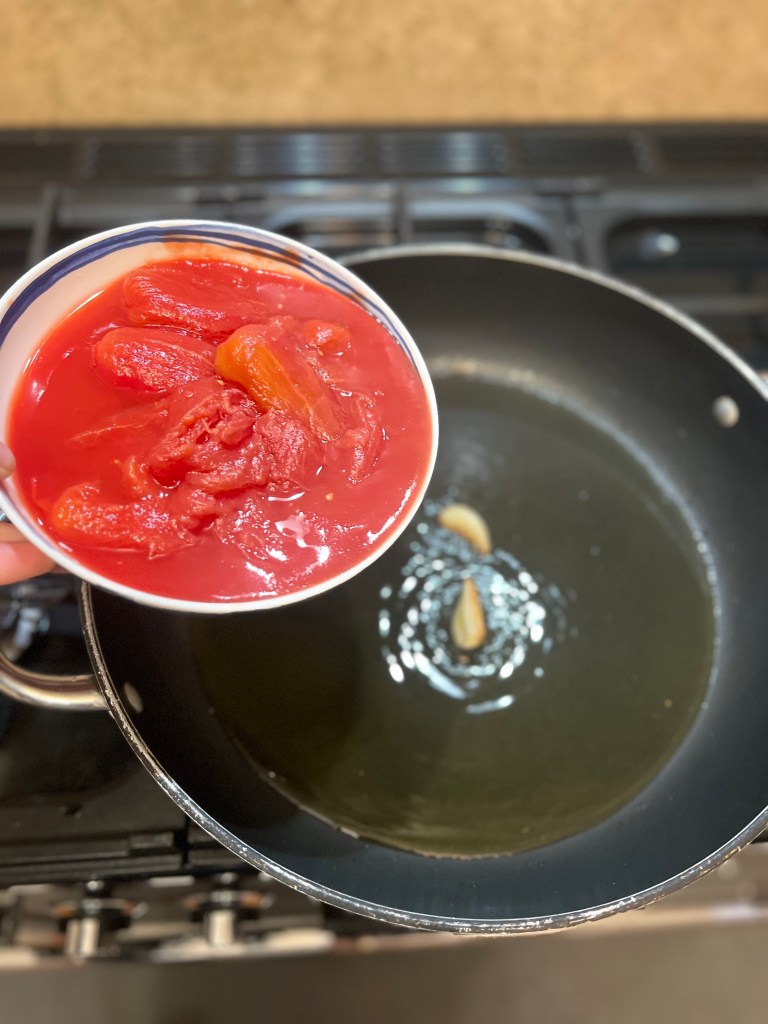 preparare il sugo rosolando l’aglio ,in mezzo bicchiere d’0lio , uire i tre pomodori , sale e cuocere per 40 minuti .