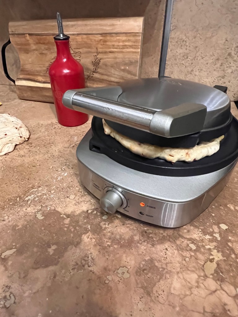 Riscaldare la piastra al max della temperatura ,stendere l’impasto a 1 cm circa ,