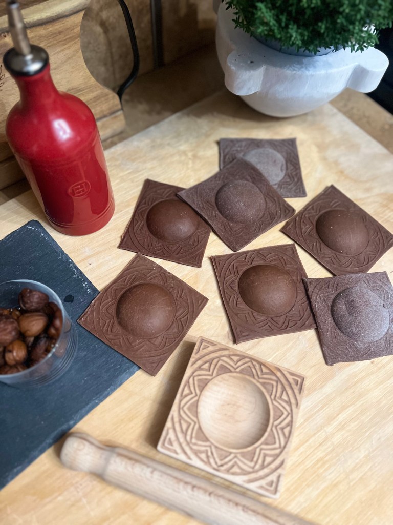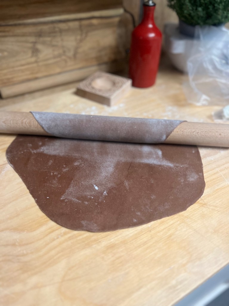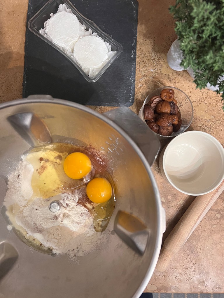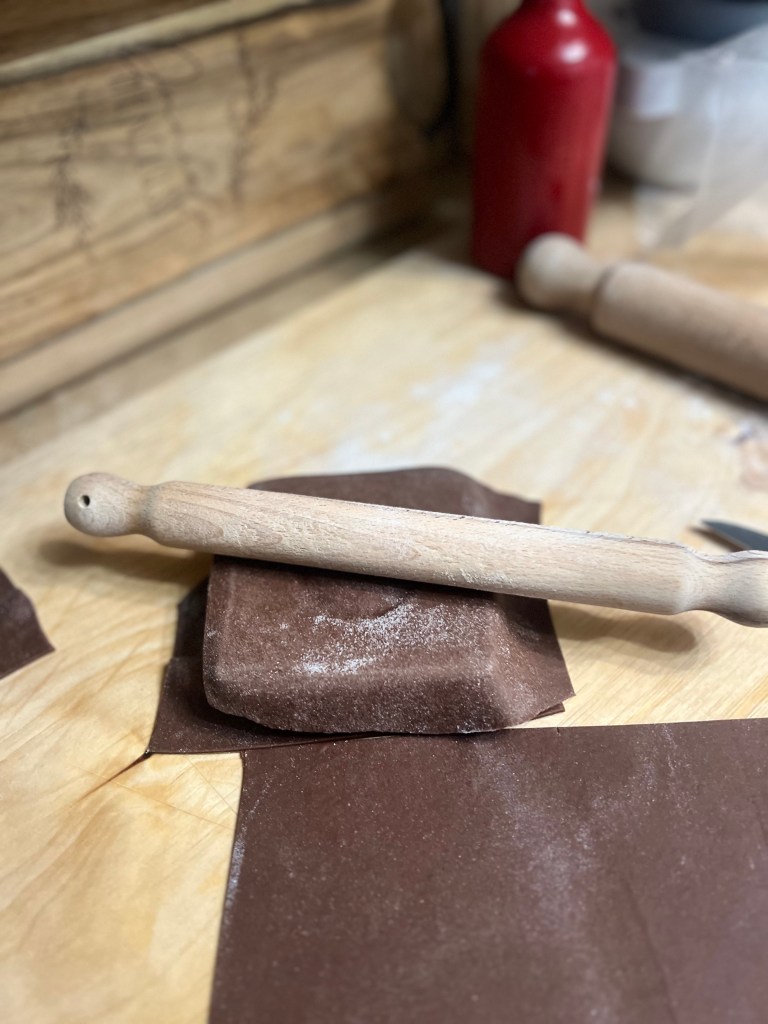 impastare a mano oppure con una planetaria la farina con cacao e uova , lavorare fino a ottenere un impasto liscio ed omogeneo , avvolgere in pellicola e lasciarlo riposare peer 30 minuti.