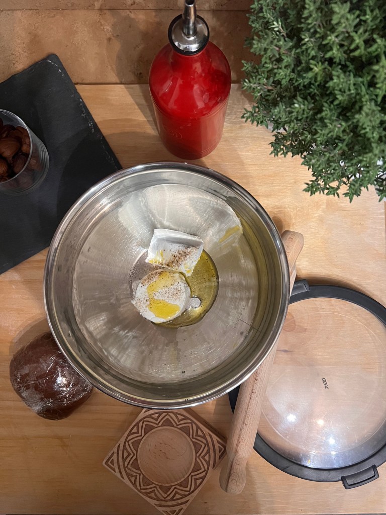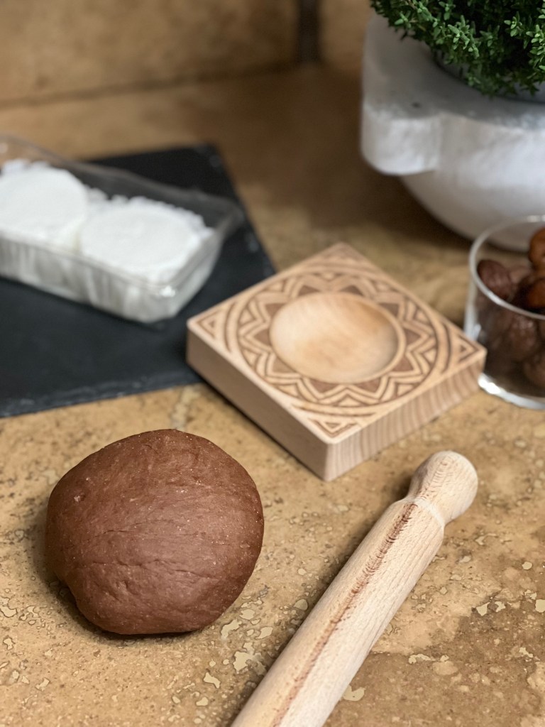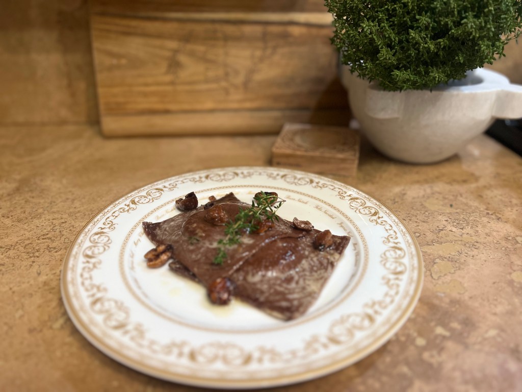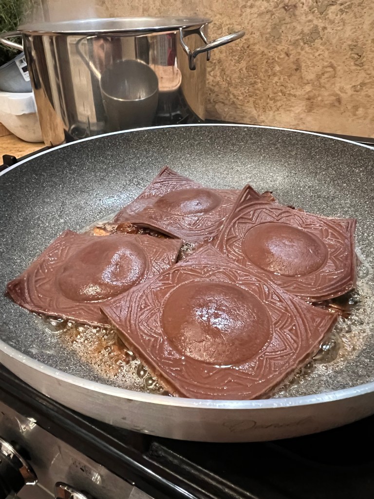 un raviolo al cacao ripieno di caprino, un esplosione di gusto , particolare il contrasto fra le note del cacao e l’ aciditá del caprino , un piatto per stupire i vostri ospiti elegante e sfizioso .
