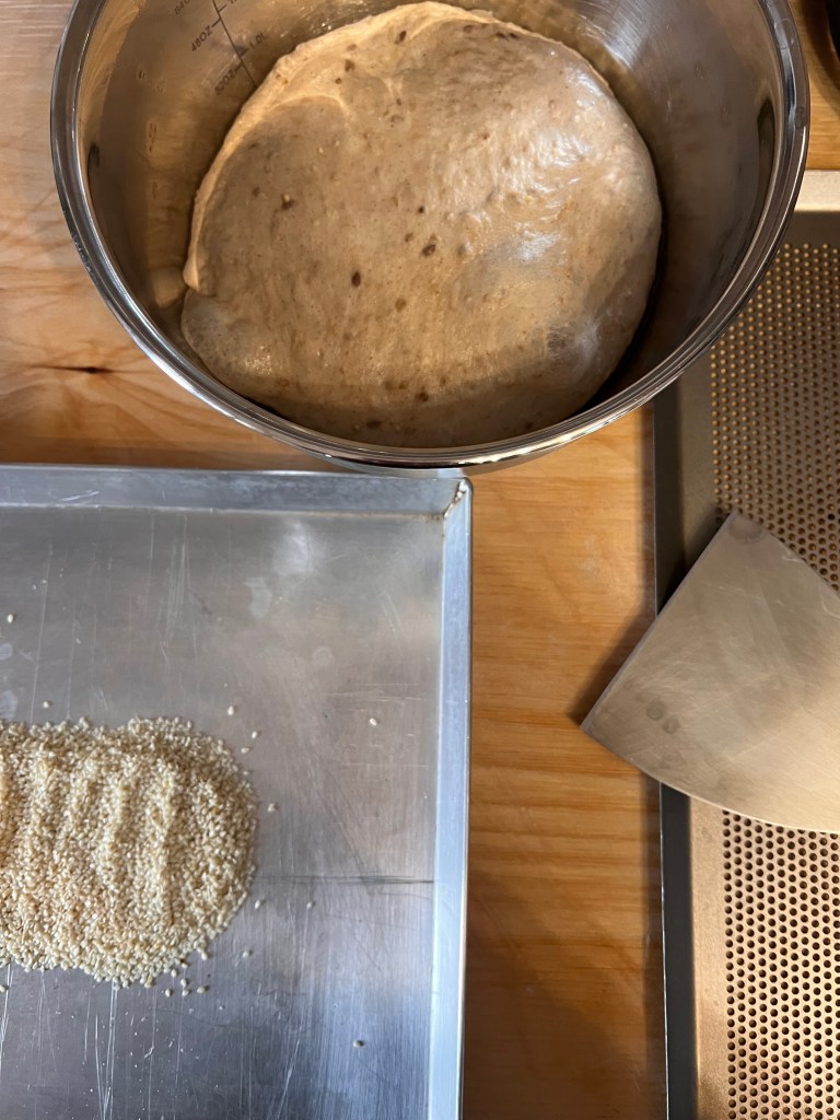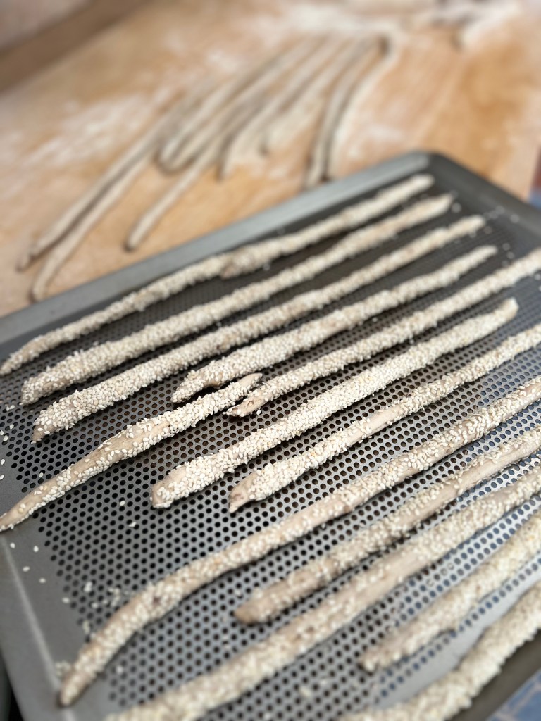 per i grissini ai cereali , innumidire i grissini e passarli nel sesamo ,