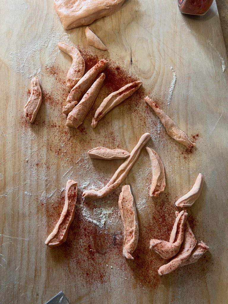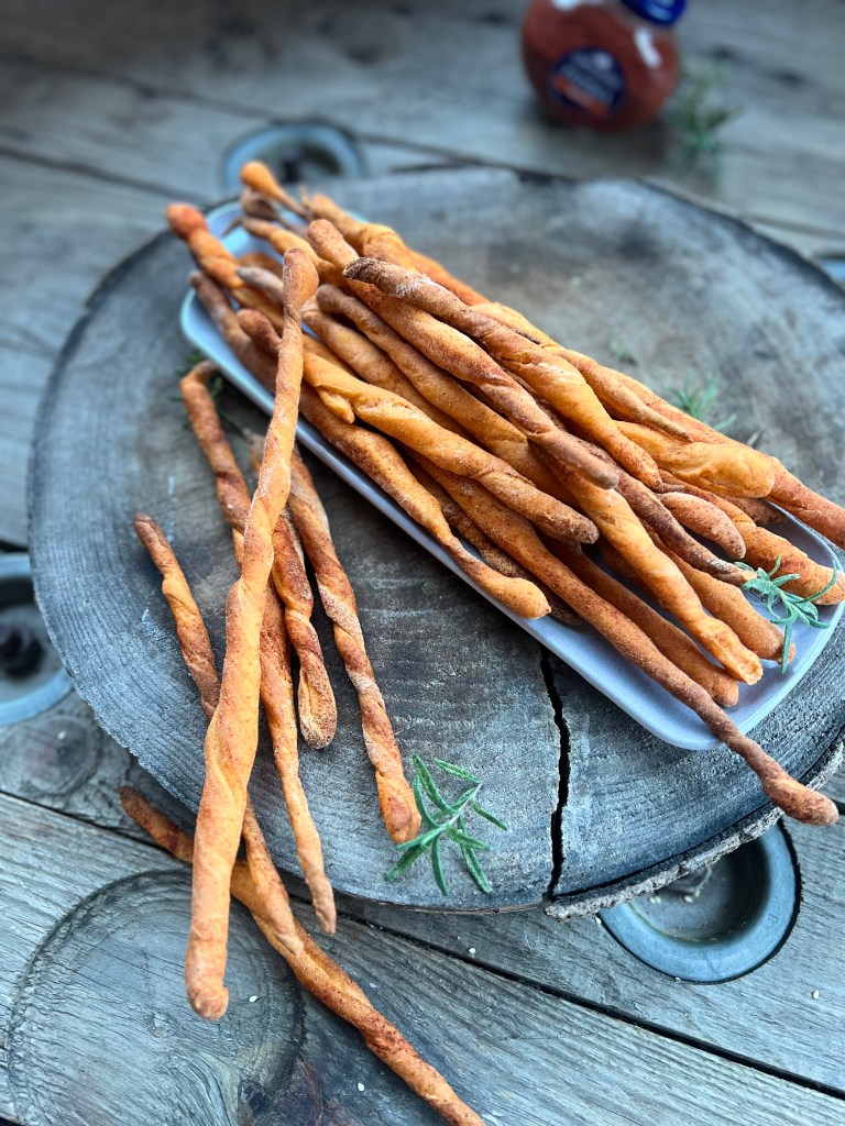 per i grissini alla paprika , spolverizzare i filoncini con la paprika ed arrotolarli ,