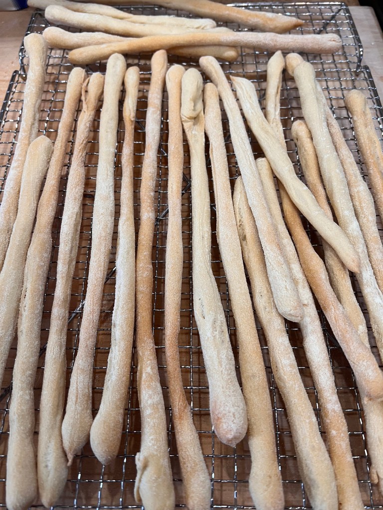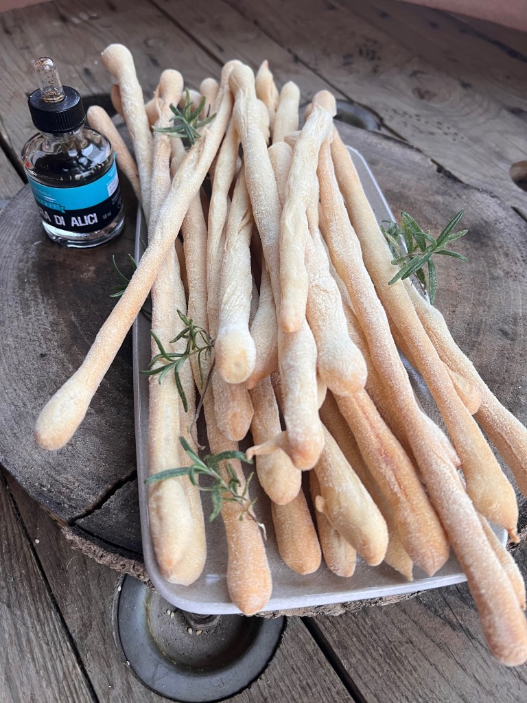 per i grissini alla colatura d’alici , spolverizzarli con semola rimacinata dopo averli allungati ,