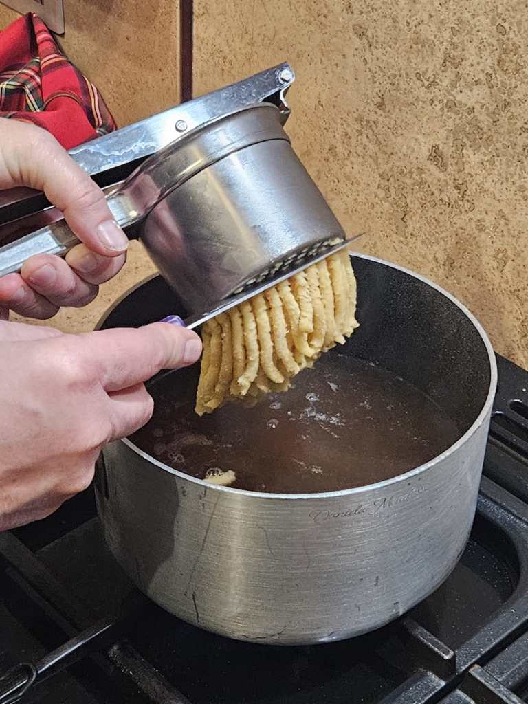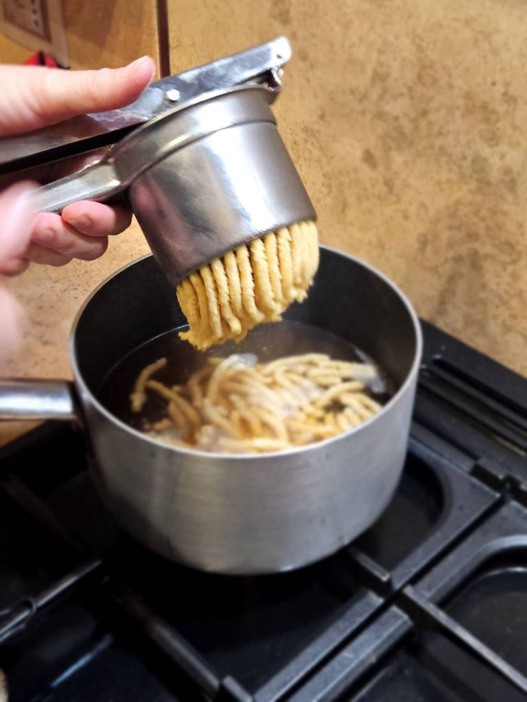 Filtrare il brodo e portare a ebollizione , dividere l’impasto e con l’apposito attrezzo (schiacciapatate a fori larghi) ottenere i passatelli direttamente nel brodo , cuocere per 2 minuti, fino a quando verranno a galla .