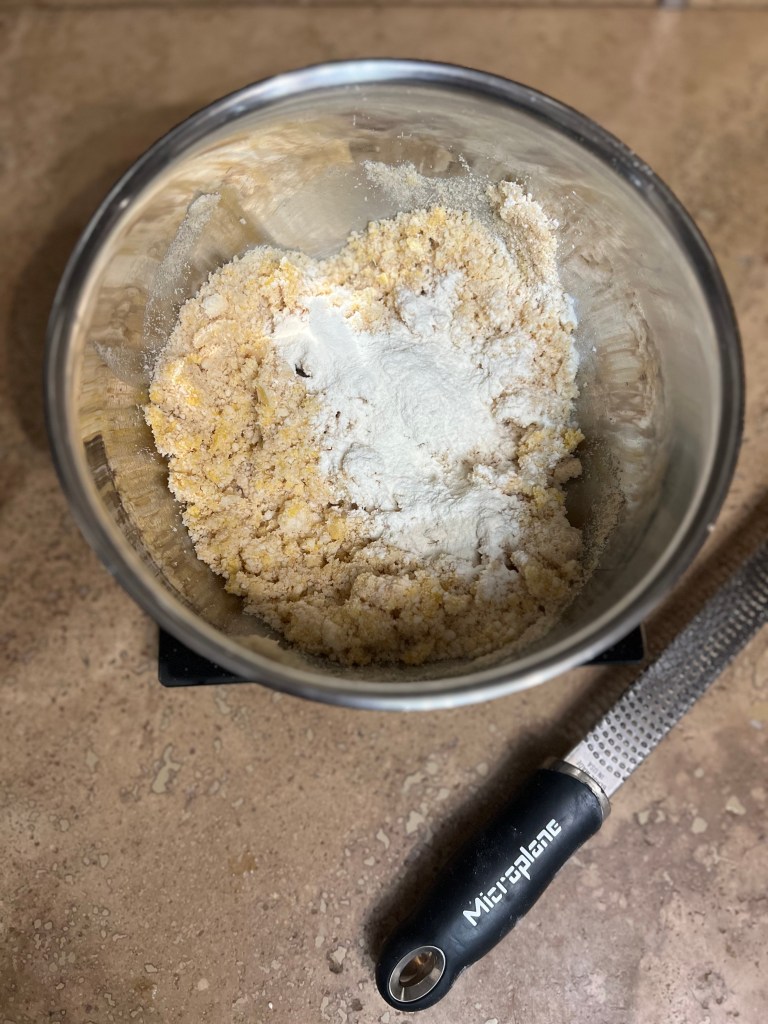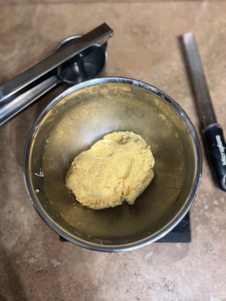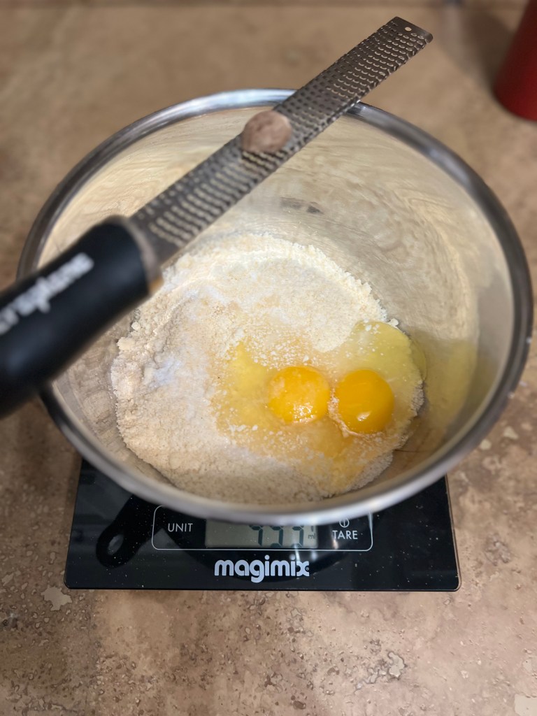 In una ciotola mettere parmigiano e pangrattato , farina , sale pepe ,scorza di limone ed in fine la noce moscata , aggiungere le uova ed amalgamare il tutto a mano fino ad ottenere un composto liscio e morbido , coprire la ciotola e lasciare a riposo in frigorifero per tre ore oppure tutta la notte .
