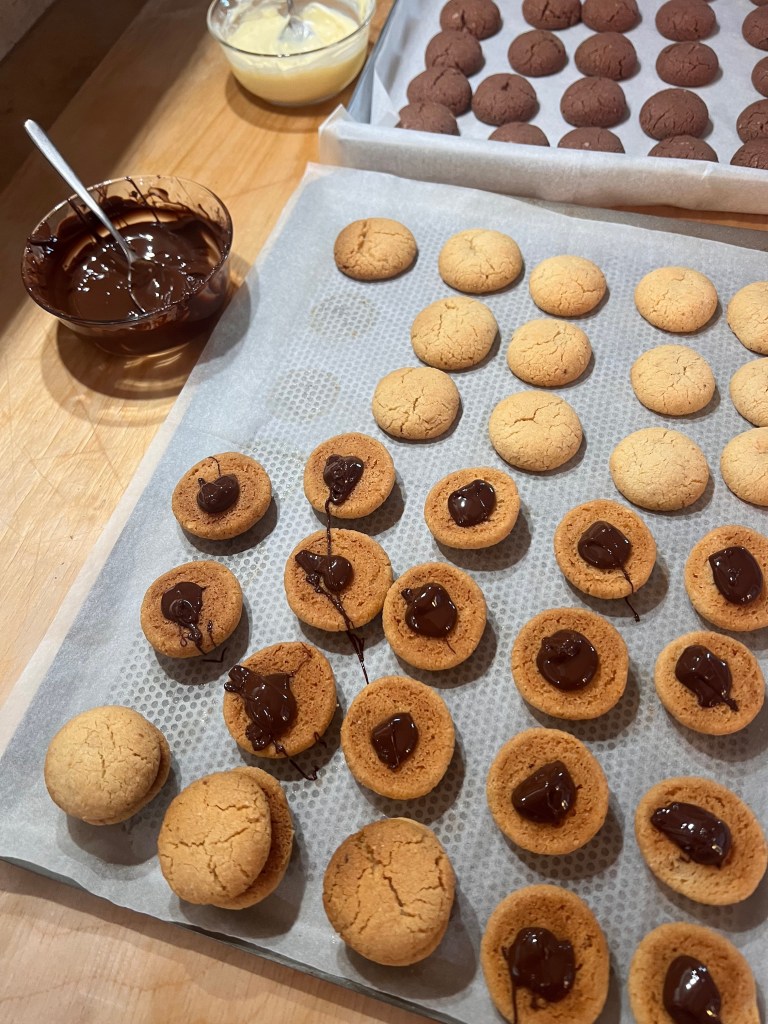Trascorso il tempo di riposo dal panetto ottenere delle piccole noci da 10 gr circa , arrotolare nel palmo delle mani e dare la forma tonda e posizionarle su una leccarda foderata con carta forno , dare ulteriore riposo in frigorifero per circa 30 minuti e successivamente cuocere in forno preriscaldato a 180° per 15 minuti