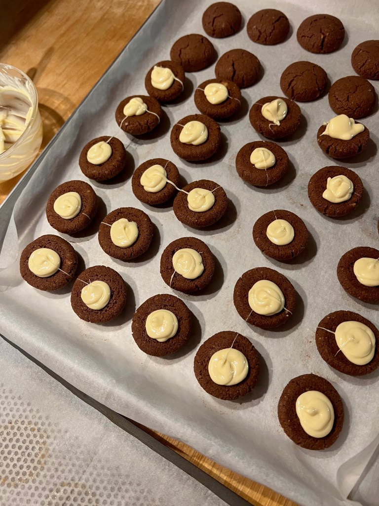 A cottura ultimata , raffreddare e procedere nel sciogliere il cioccolato a bagnomaria oppure al microonde ,farcire i baci ed unire i due biscotti .