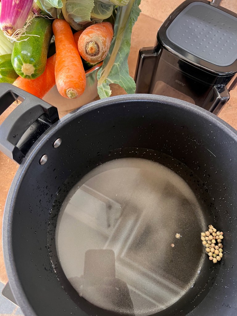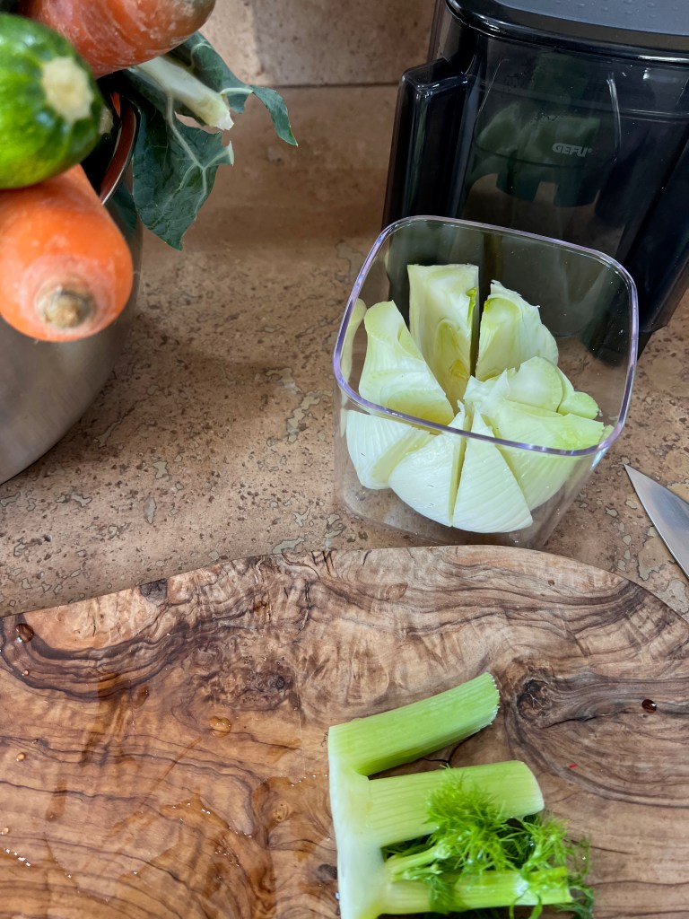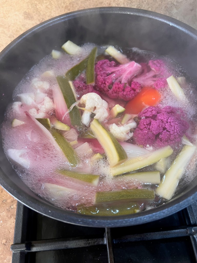 aggiungere le verdure partendo da : finocchio , carota , cuocere per 2 minuti ed aggiungere cavolfiore , cuocere per altri 2 minuti e proseguire aggiungendo zucchine e cipolle ,cuocere per 4 minuti e terminare .